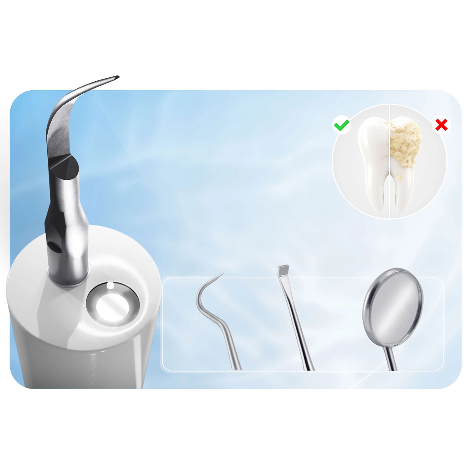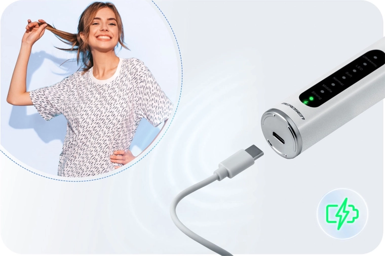Rijke accessoires en eenvoudig onderhoud: In de set vindt u 4 verwisselbare koppen (2 vlakke, 2 spitse) voor verschillende reinigingsbehoeften, een set roestvrijstalen dentale instrumenten (spiegeltje, schraper, sonde) en een sleetje voor het wisselen van de koppen. De schroefdraadbevestiging zorgt voor zekerheid tijdens het werk. Dankzij USB‑C-opladen en een krachtige batterij kunt u meerdere sessies doen op één lading. De constructie met IPX7 bestendigheid biedt bescherming tegen spatwater.