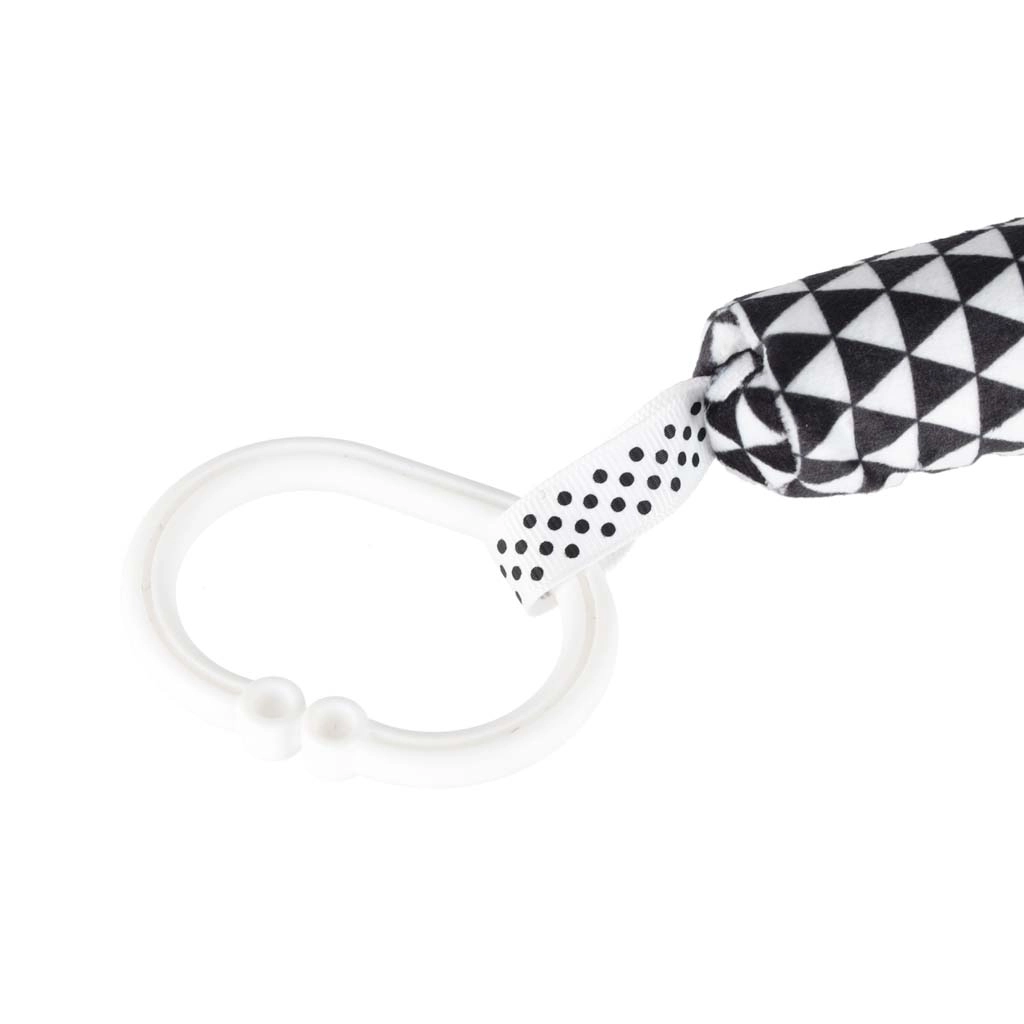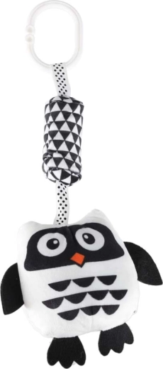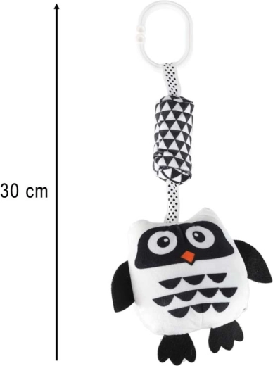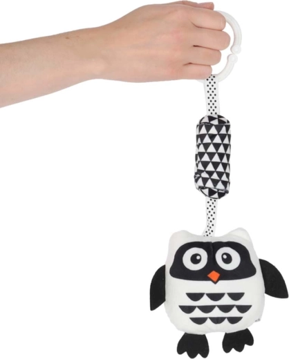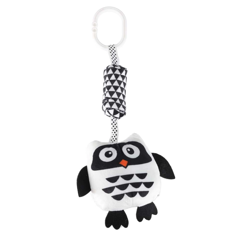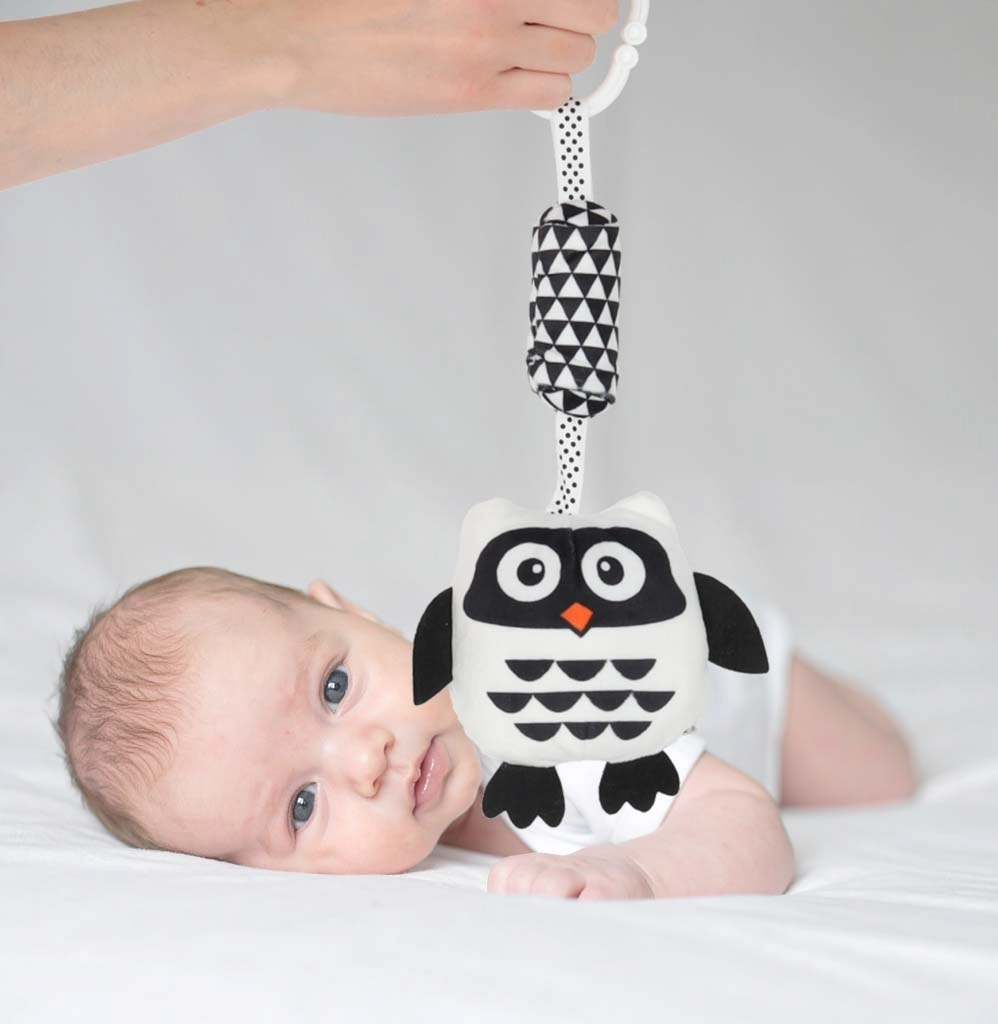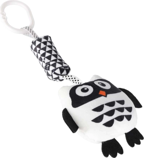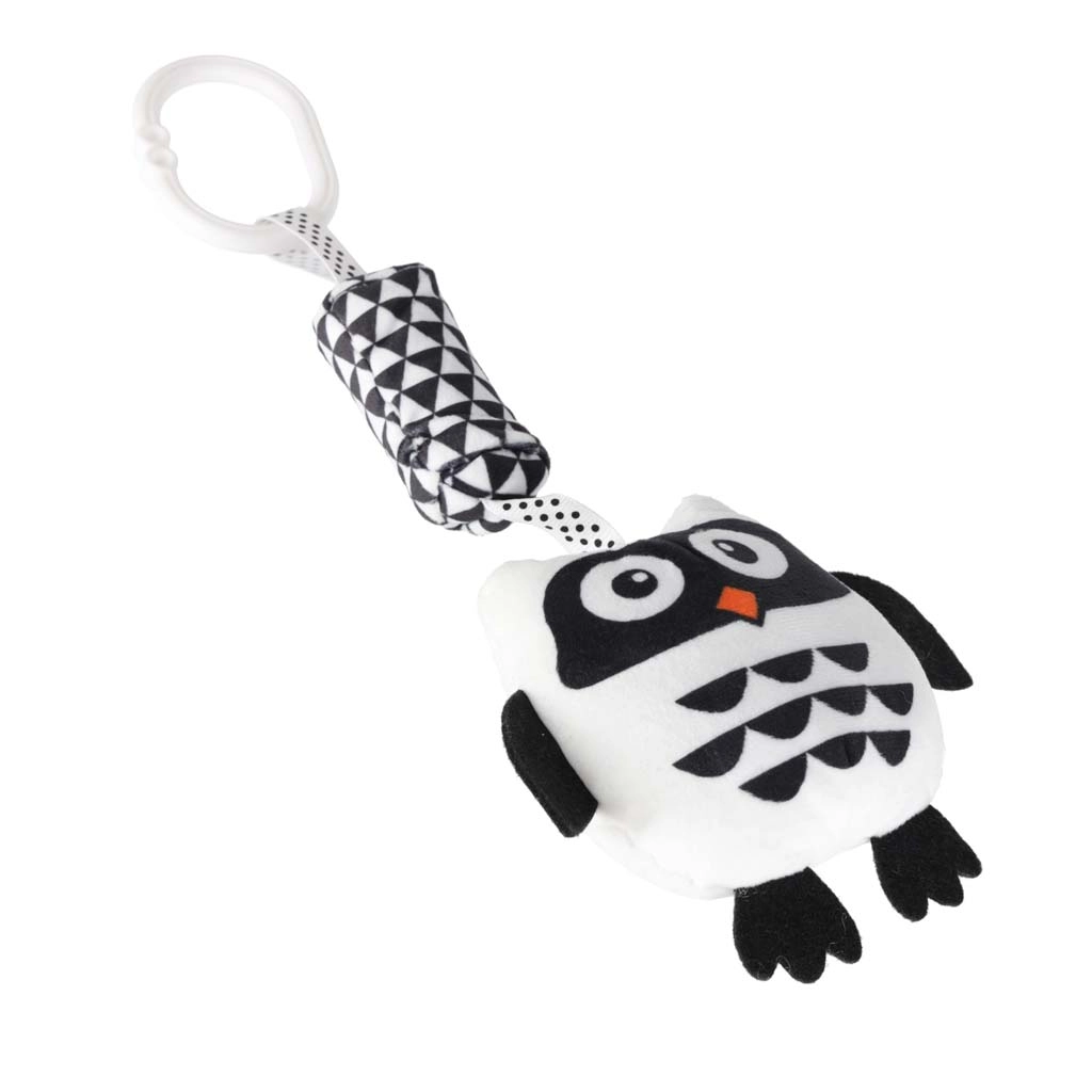 Schattige hangende uil in zwart-wit voor de allerkleinsten, ondersteunt visuele stimulatie, zintuiglijke ontwikkeling en plezier onderweg. Dankzij de praktische clip bevestig je hem eenvoudig aan kinderwagen, autostoeltje en ledikant. Zachte materialen, verschillende texturen en rammelende/knisperende elementen stimuleren grijpen en ontdekken.