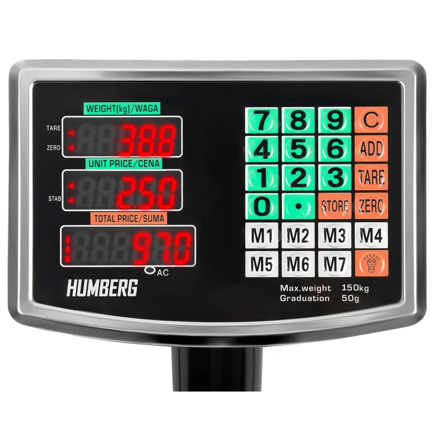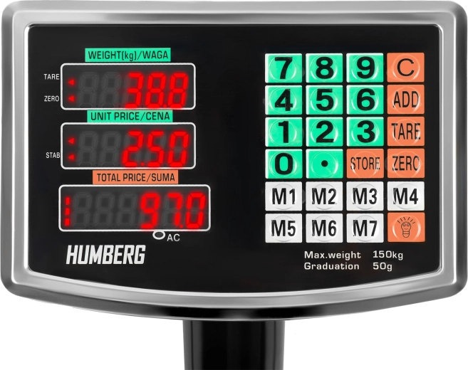 Deze professionele platformweegschaal HUMBREG MH-191 is ontworpen voor nauwkeurig en snel wegen in veeleisende omgevingen. Nauwkeurigheid 0,05 kg, maximale belasting 150 kg en een drielijns achtergrondverlichte lcd voor duidelijke aflezingen vergemakkelijken het werk in magazijnen, werkplaatsen en bij expeditie. De overbelastingswaarschuwing beschermt het apparaat en de gewogen goederen.