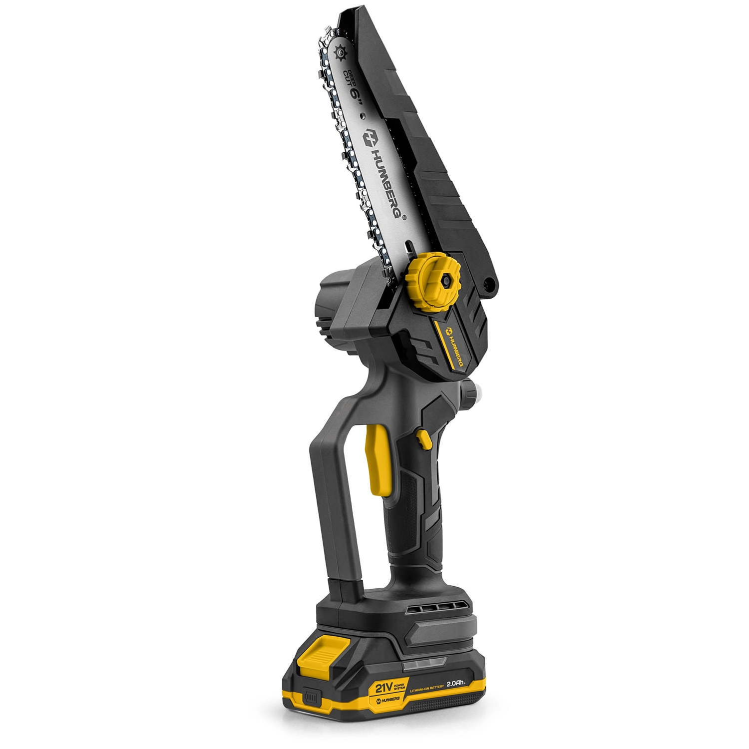 Compacte en krachtige accu mini-zaag van Humberg met een borstelloze motor biedt snel en soepel zagen tot 8,2 m/s, automatische kettingsmering en gereedschapsloze kettingspanning. In de set vind je 2× 21 V 2 Ah accu, 2× 6" geleider en 2× ketting – alles overzichtelijk opgeborgen in een stevige koffer voor gemakkelijk transport. Ideaal voor snoeien van takken, tuinwerk en lichte timmerklussen met maximaal comfort dankzij de ergonomische, rubberen handgreep en het lage gewicht van 1,4 kg.