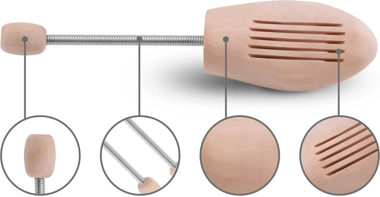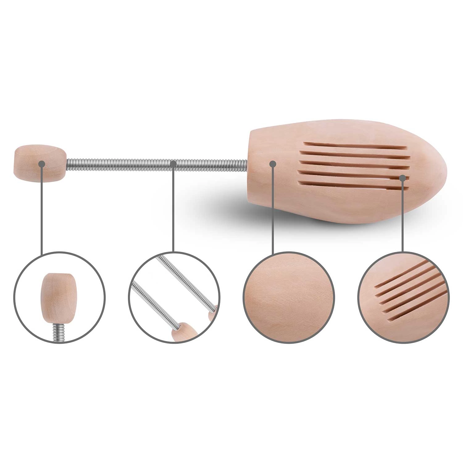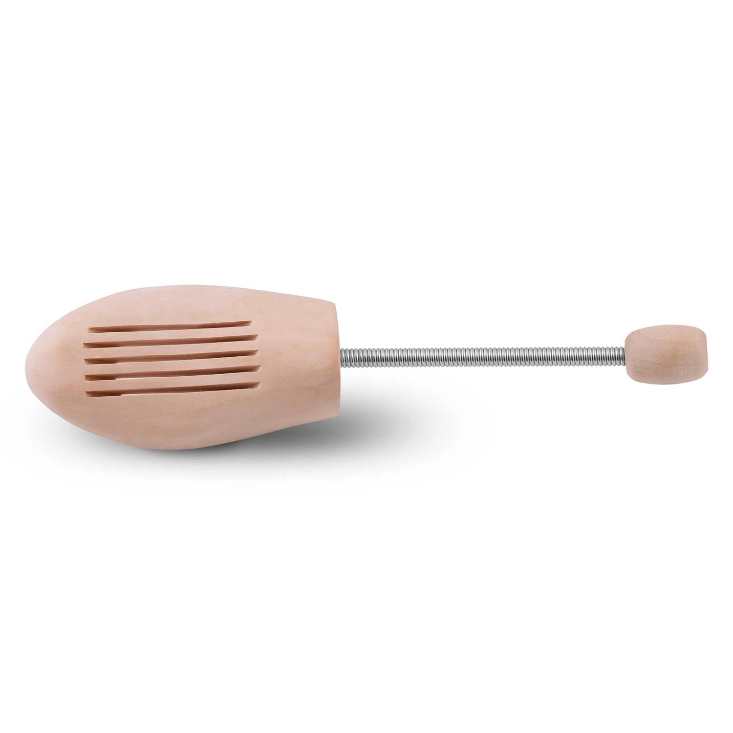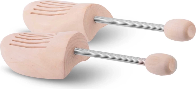 Ontdek een eenvoudige manier om je nette en alledaagse schoenen in topconditie te houden. MASSIDO veerspanners met houten neuzen en ventilatiegroeven spannen het bovenwerk, waardoor de vorming van vouwen en rimpels na het dragen wordt verminderd. Het natuurlijke hout absorbeert bovendien vocht en helpt de schoenen na een lange dag sneller te drogen.