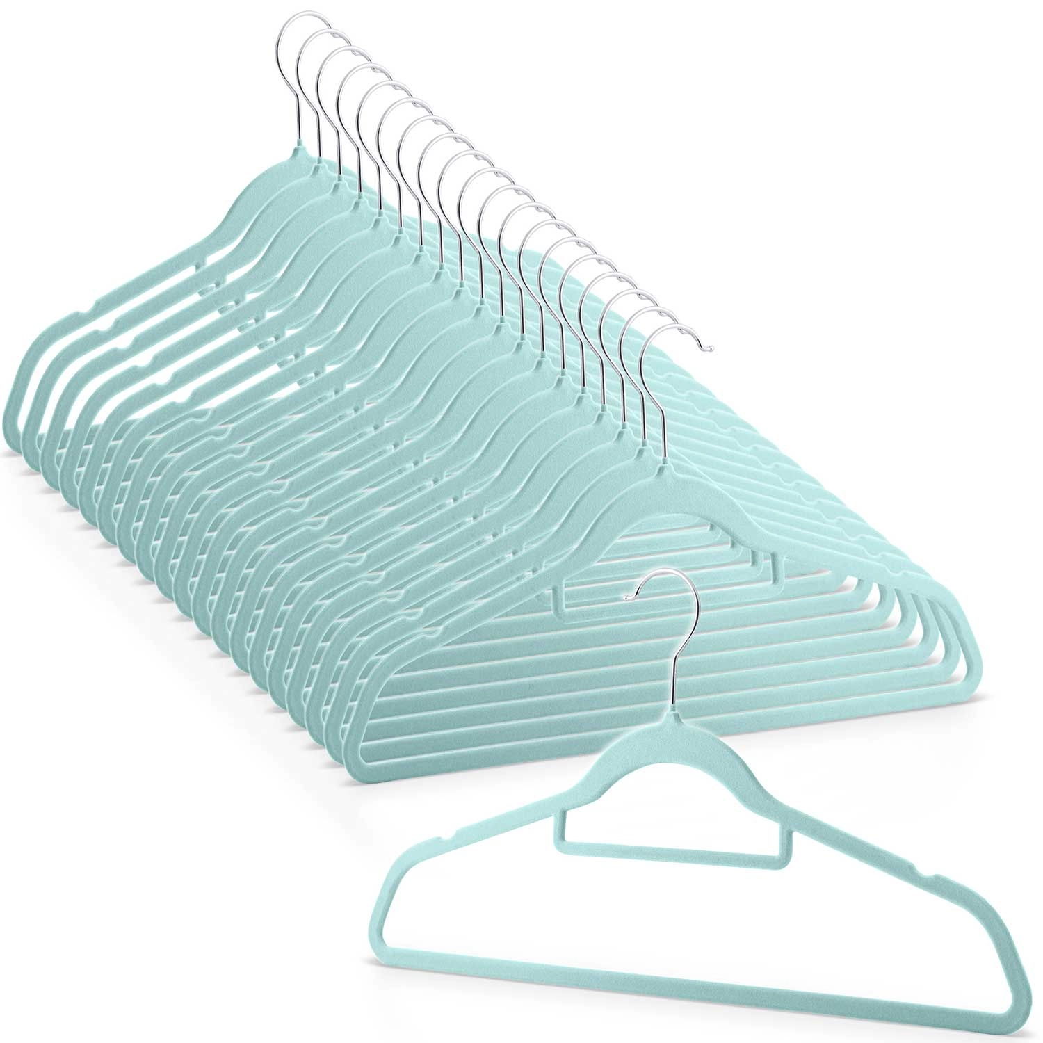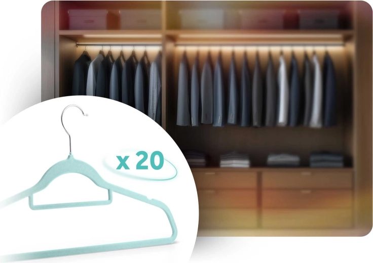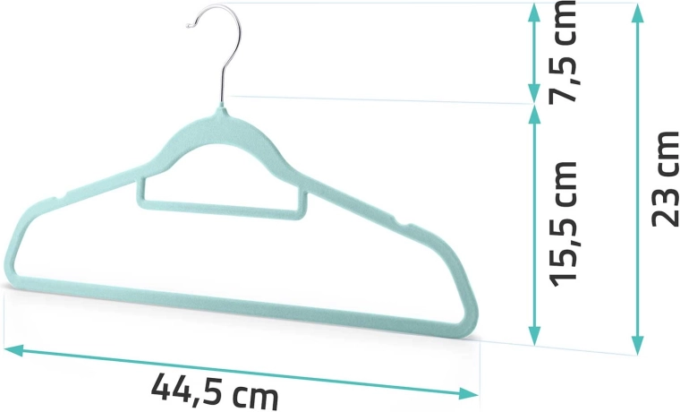 De praktische en stijlvolle set velours kledinghangers MASSIDO zorgt voor orde en zorgvuldige behandeling van je kleding. Zacht velours vormt een anti‑slip oppervlak dat voorkomt dat overhemden, jurken en colberts wegglijden, terwijl de stevige PP‑kern de vorm behoudt en niet doorbuigt, zelfs niet bij zwaardere stukken.