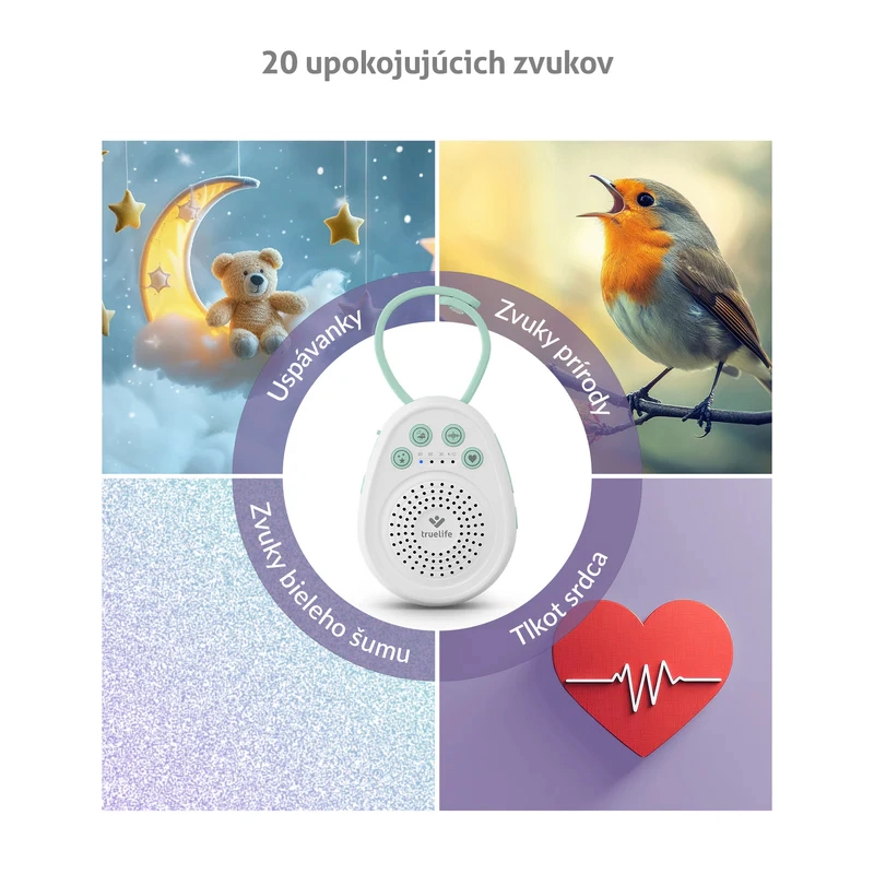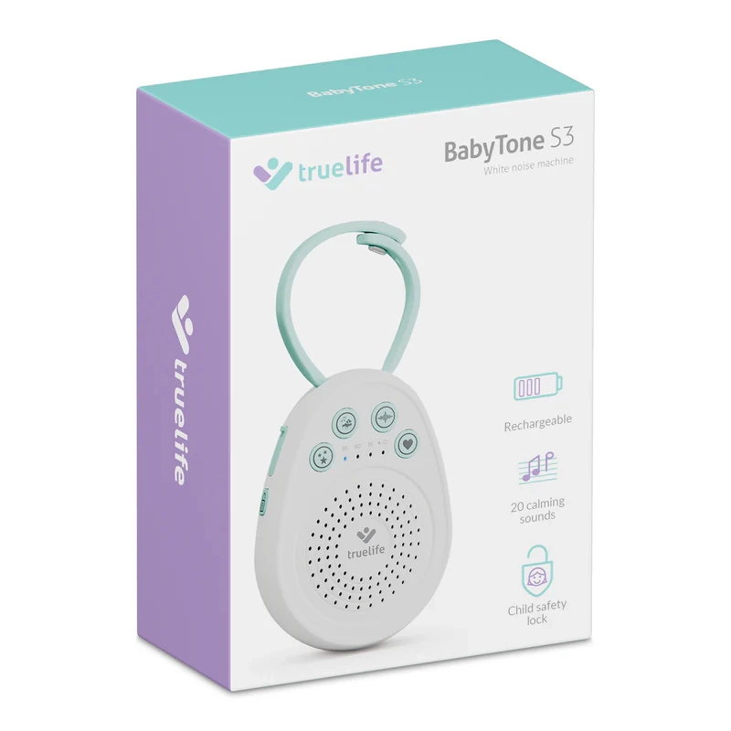 TrueLife BabyTone S3 is een compacte, draagbare slaaptrainer die helpt baby’s sneller in slaap te vallen en langer door te slapen. Via een kwaliteitsluidspreker speelt hij in een lus tot 20 geluiden af – van zachte melodieën en natuurgeluiden tot de populaire witte ruis en een authentieke hartslag die een veilig gevoel oproept, bekend uit de prenatale periode. Dankzij het geheugen van het laatste geluid wordt na inschakelen automatisch afgespeeld wat het beste werkt.