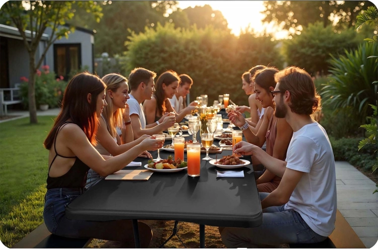 - Waterbestendig, eenvoudig te reinigen PE – ideaal voor tuin, terras en catering.