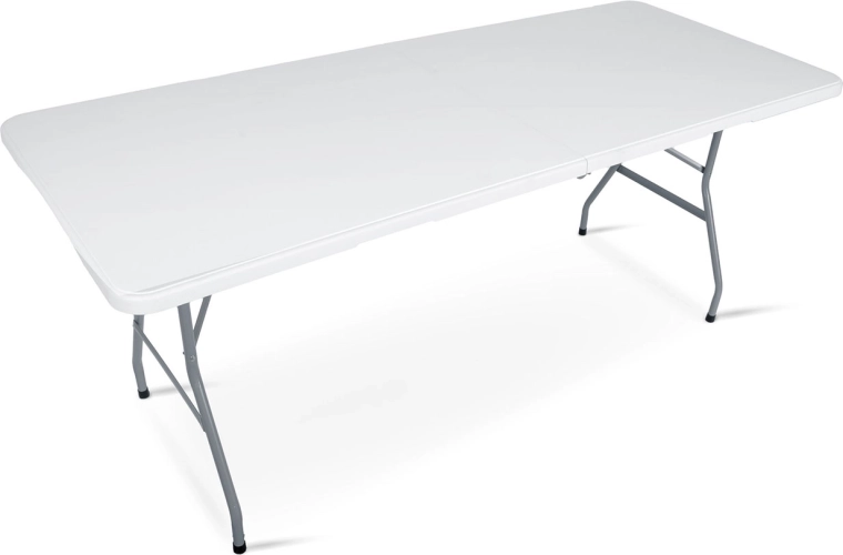 De betrouwbare inklapbare tafel van 180 cm is een uitstekende keuze voor tuin, terras en binnenruimtes. Het robuuste stalen frame met poedercoating zorgt voor stabiliteit en een lange levensduur, terwijl het PE-blad bestendig is tegen water, UV en vlekken. Dankzij de inklapbare constructie zet je hem in een handomdraai op en berg je hem na het evenement weer gemakkelijk op.