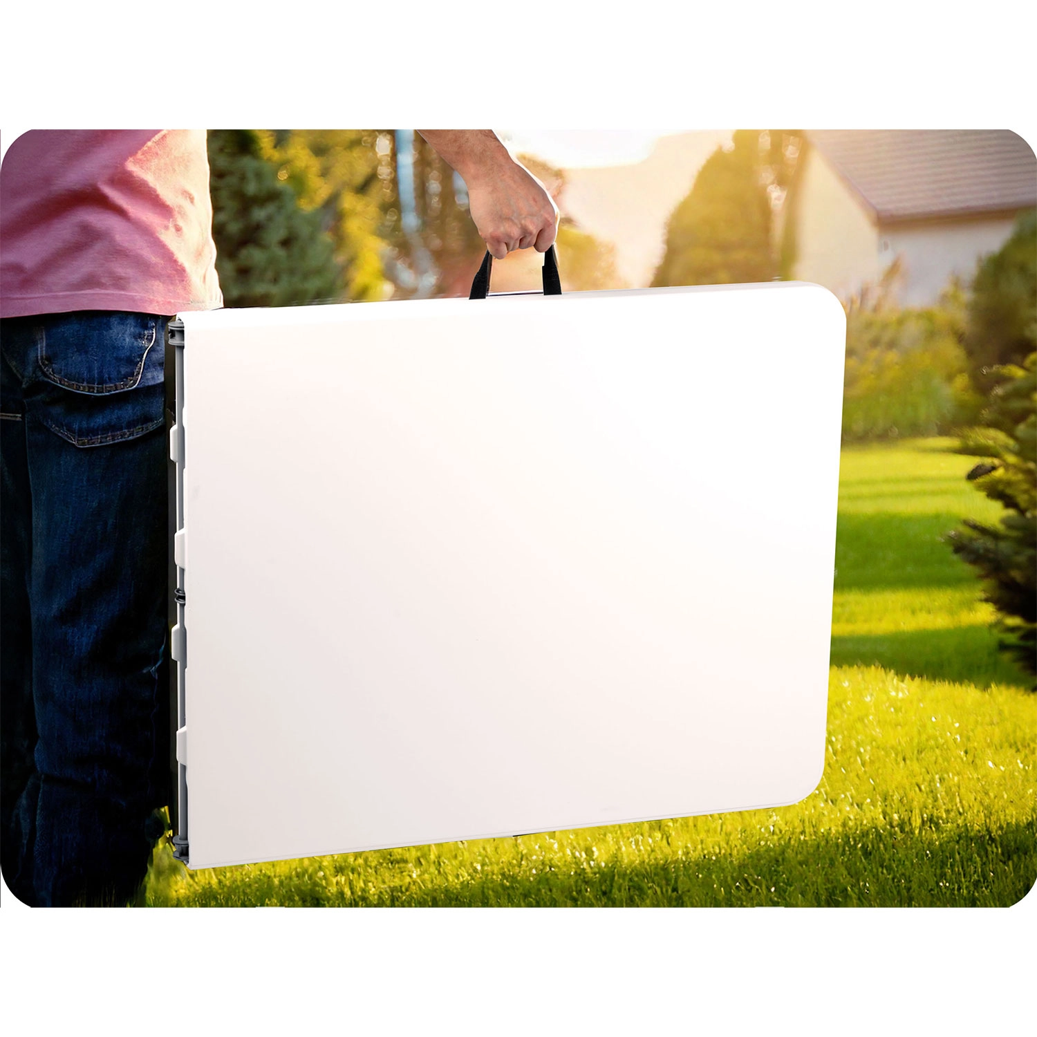 De tafel klapt halverwege dicht tot een plat koffertje met een praktisch handvat. Ideaal voor snelle verplaatsingen tussen tuin, terras of event en voor ruimtebesparende opslag.