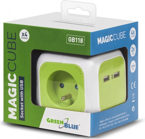 De GREENBLUE Magic Cube breidt het aantal beschikbare stopcontacten effectief uit en maakt het mogelijk meerdere apparaten tegelijk van stroom te voorzien. Twee geïntegreerde USB-poorten zorgen voor snel en handig opladen van telefoon, tablet of koptelefoon zonder aparte oplader. Het compacte kubusdesign bespaart ruimte en voorkomt blokkering van aangrenzende stopcontacten.