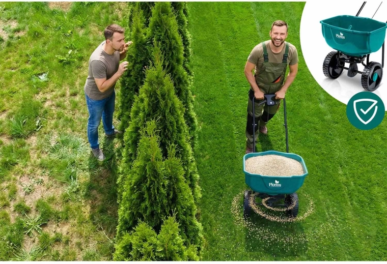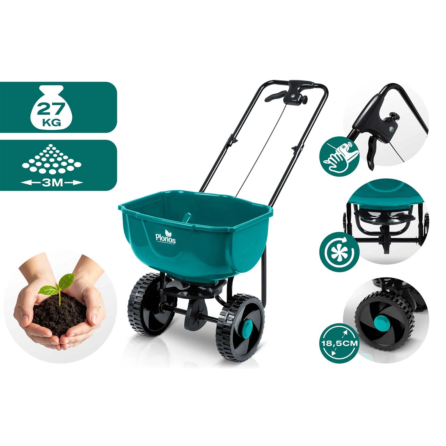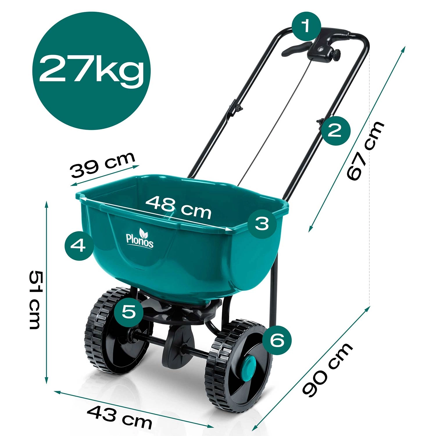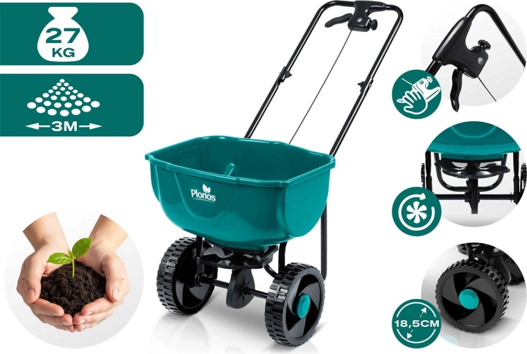 De grote capaciteit van 27 l (tot 27 kg) verlengt de werkintervallen zonder vaak bij te vullen. Grote wielen zorgen voor een soepele loop, ook op ongelijke ondergrond, en de duurzame kunststof trechter is eenvoudig te reinigen. De strooier is ideaal voor het voorjaar (inzaaien van het gazon), de zomer (bemesten en regeneratie), de herfst (versterken van het gazon voor de winter) en de winter (strooien van zout of zand op trottoirs en opritten).