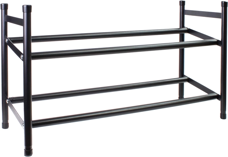 Praktisch en duurzaam schoenenrek met verstelbare breedte voor overzichtelijke opslag van schoenen. Dankzij de metalen constructie is het stabiel, duurzaam en perfect geschikt voor de hal of kleedkamer. De twee lagen bieden voldoende ruimte voor alledaagse paren schoenen en de elegante zwarte afwerking past naadloos in een modern interieur.