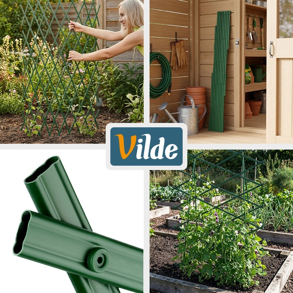 De installatie is snel en intuïtief – schuif het trellis eenvoudig uit tot het gewenste formaat en bevestig het aan hek of muur. Het klassieke ruit-/kruismotief zorgt voor voldoende hecht- en steunpunten voor ranken en scheuten.