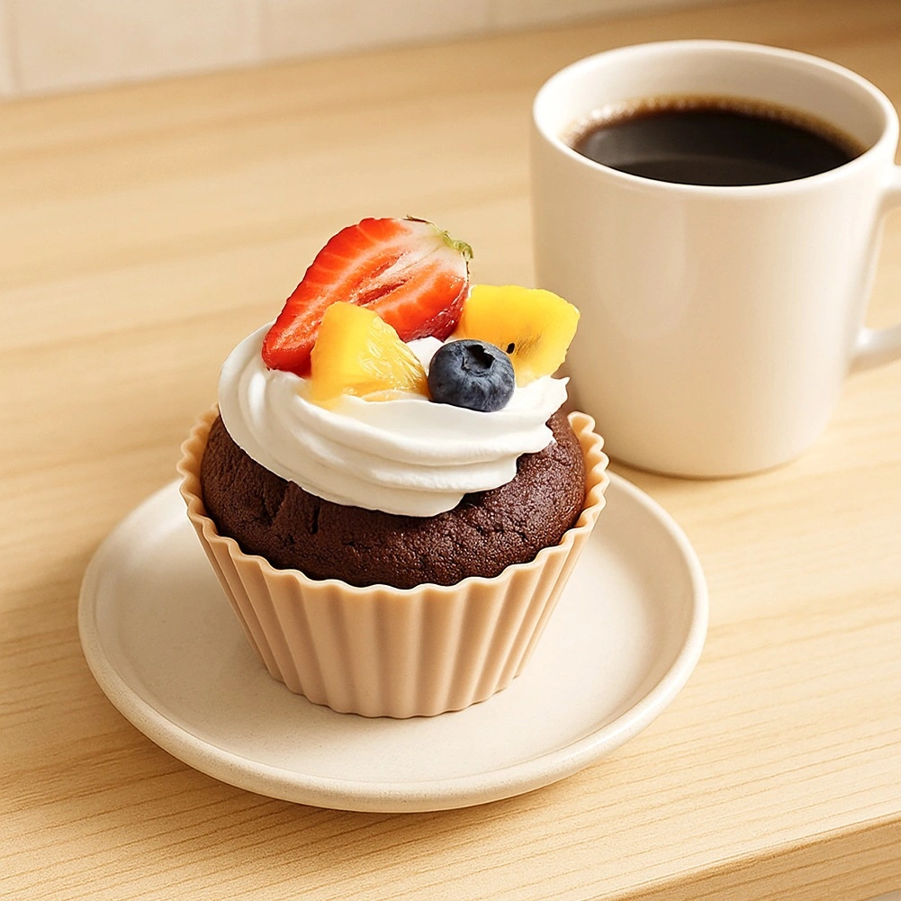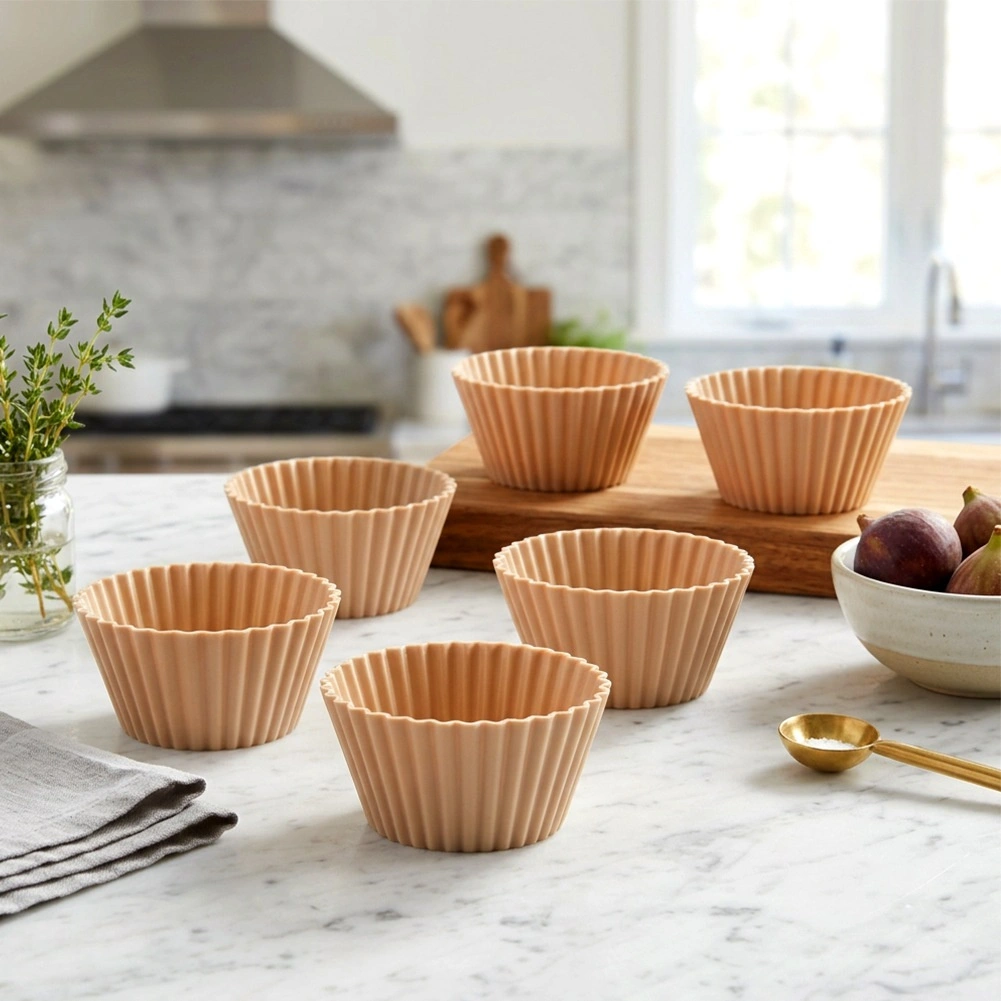 De set bevat 6 hoogwaardige siliconen vormpjes met een bovendoorsnede van 6,5 cm, een bodemd doorsnede van 5 cm en een hoogte van 3 cm. De gegolfde rand zorgt voor een esthetische look en garandeert de perfecte muffinvorm. Siliconen geleidt warmte uitstekend, waardoor het beslag gelijkmatig gaart zonder invetten of bebloemen.