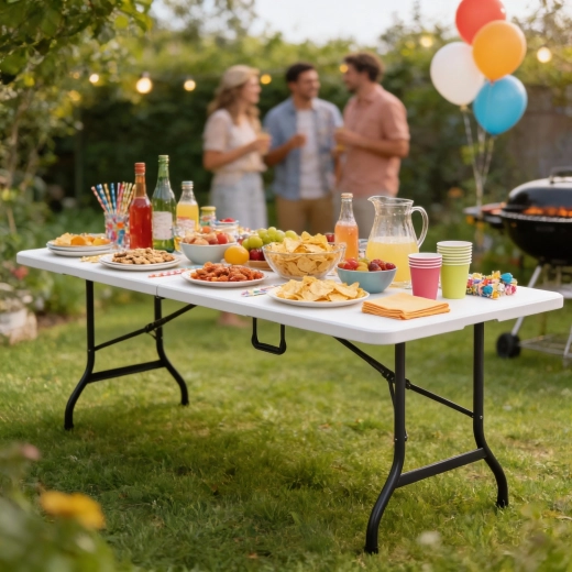 Robuuste opvouwbare tafel met groot werkblad, ideaal voor familiefeesten, bedrijfsevenementen en buitencatering. Het duurzame HDPE-kunststof blad is makkelijk schoon te maken, neemt geen vocht op en is bestand tegen buitenomstandigheden, terwijl het stalen frame met verstevigingen en antislipdoppen stevig op zijn plaats blijft.