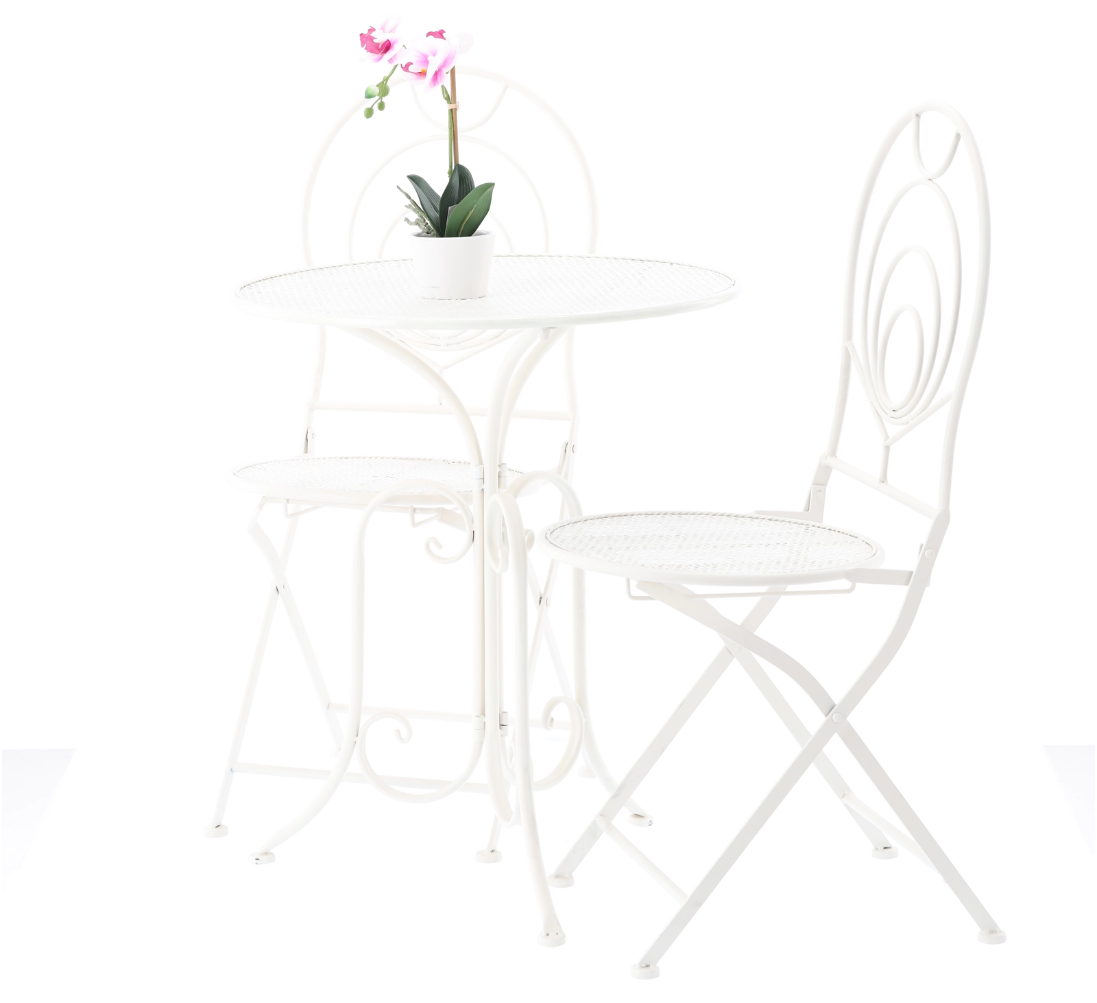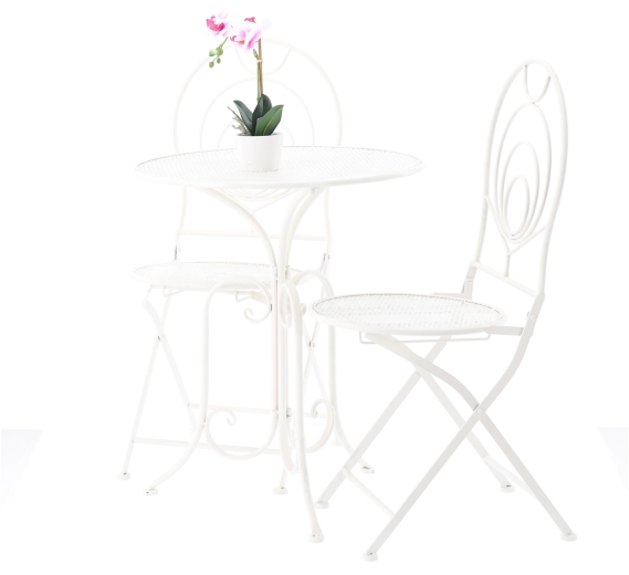 Gedecoreerde metalen details en de zuiver witte kleur geven balkon, terras en tuin een verfijnde bistro-uitstraling die eenvoudig te combineren is met accessoires.