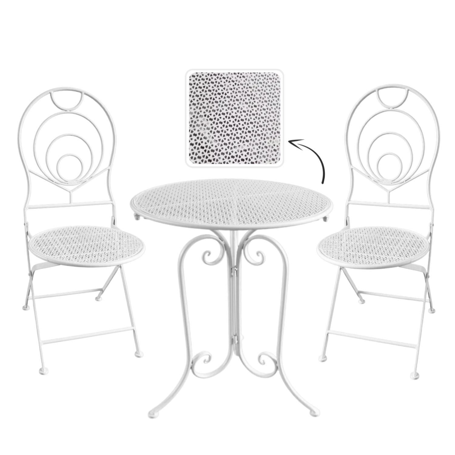De stoelen zijn inklapbaar, zodat je de set na de koffiepauze snel kunt opruimen, zelfs in een kleinere ruimte. De ronde tafel biedt een prettig oppervlak voor drankjes of decoratie. Dankzij de universele witte kleur en het retro sierelementen past de set in tuinen, cafés en interieurs in vintagestijl.