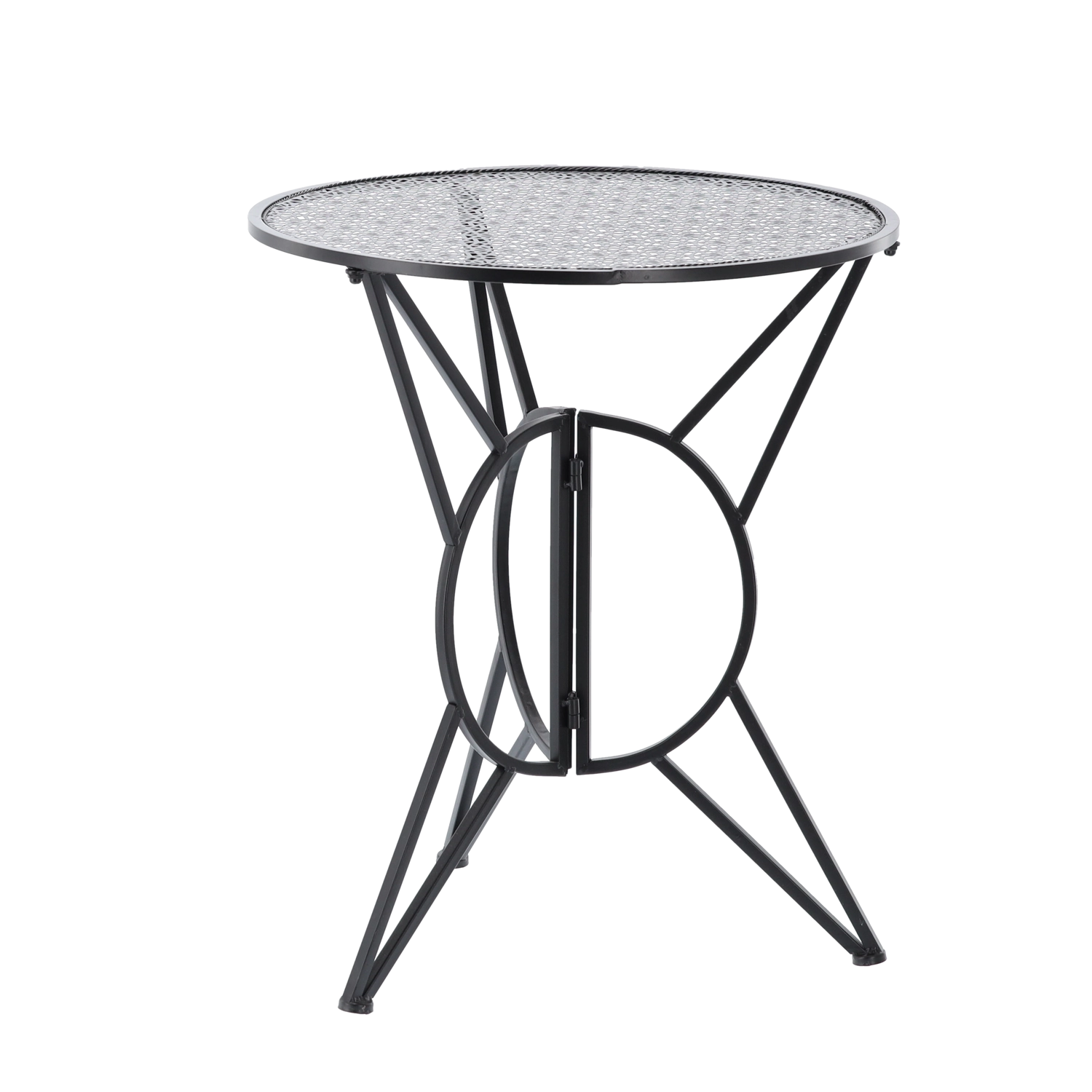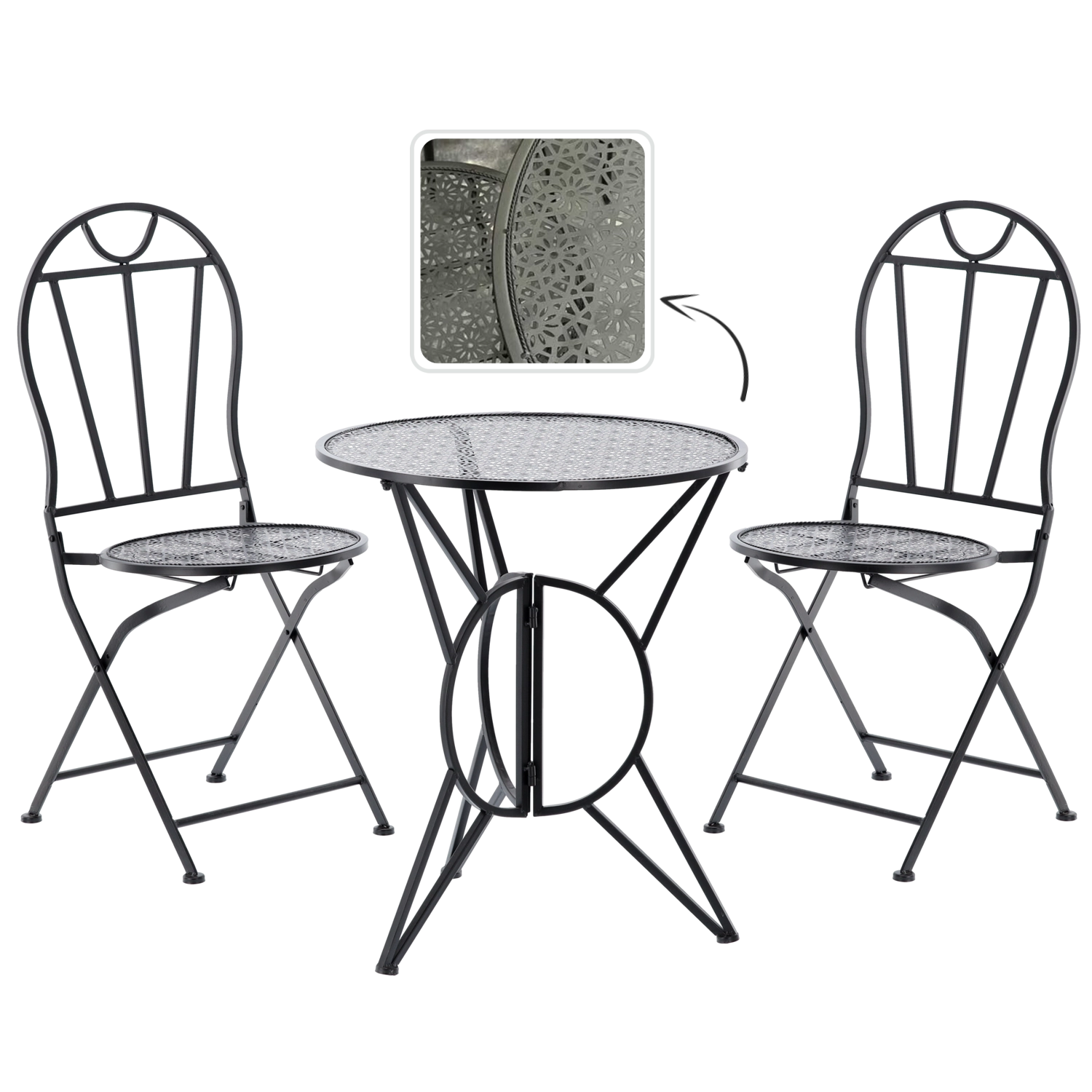 Elegante metalen bistroset in retrostijl voor balkon, terras en tuin, met een stevige en stabiele constructie, opklapbare stoelen voor eenvoudig opbergen en stijlvolle geperforeerde patronen op het tafelblad en de zittingen. Het duurzame metalen design met een matzwarte afwerking is ideaal voor buitengebruik en garandeert comfortabel zitten voor koffie of zomerse diners.