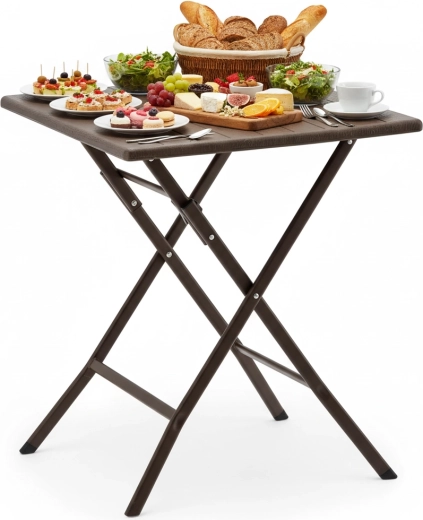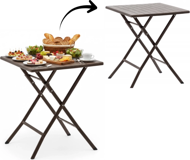 Praktische opvouwbare kampeertafel met afmetingen 61,5 × 61,5 × 73 cm, die een licht gewicht combineert met hoge stabiliteit. Het oppervlak in een bruine houttint past moeiteloos bij je tuinmeubilair en dankzij de opvouwbare poten berg je hem in een handomdraai op, zelfs in kleine ruimtes.