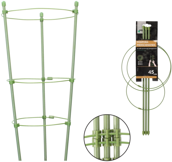 Deze ronde steun met drie ringen is ontworpen om de groei van sier- en nuttige planten veilig te geleiden. Robuust staal met een polyethyleencoating is bestand tegen vocht, UV-straling en mechanische schade, waardoor hij het hele seizoen en langer meegaat. De groene uitvoering zorgt voor een onopvallende uitstraling in border en plantenbak.