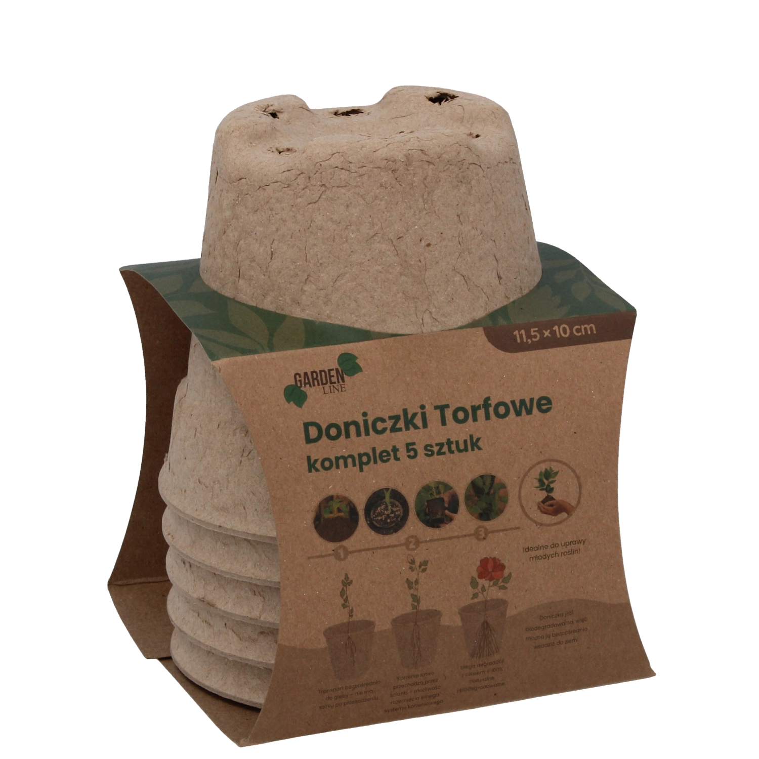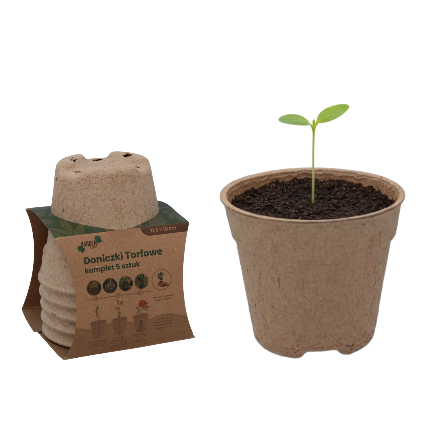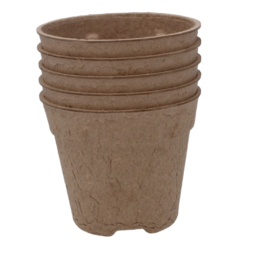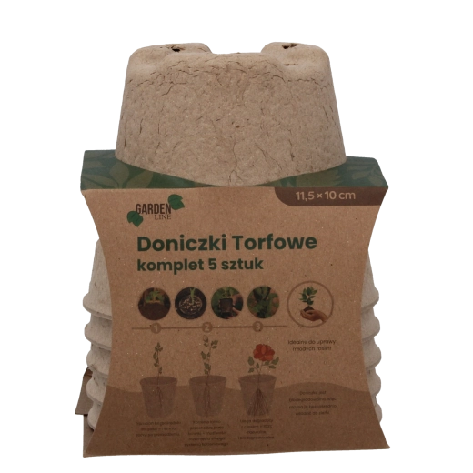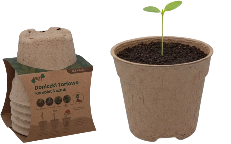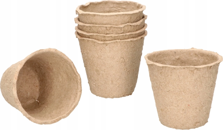 Ecologische set van vijf turfpotten met afmetingen 11,5 × 10 cm, ideaal voor het voorzaaien van groente-, kruiden- en bloemzaailingen. De potten zijn 100% biologisch afbreekbaar, bevorderen een gezonde wortelgroei en maken direct uitplanten in de grond zonder verplanten mogelijk – zonder stress voor de planten en zonder onnodig afval.