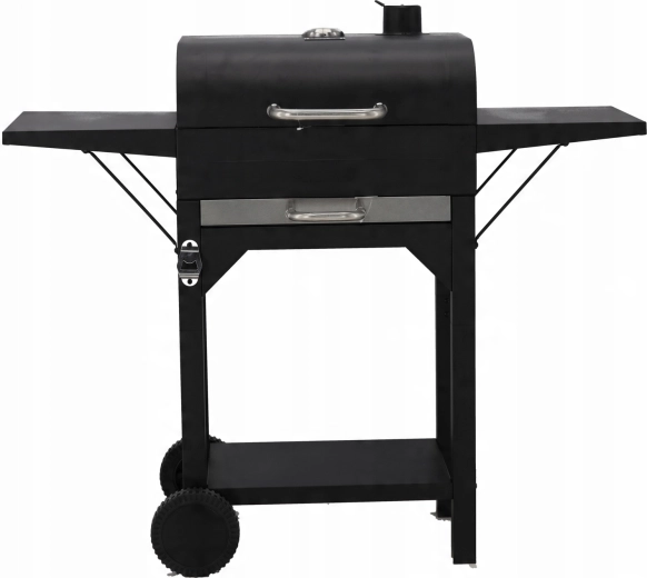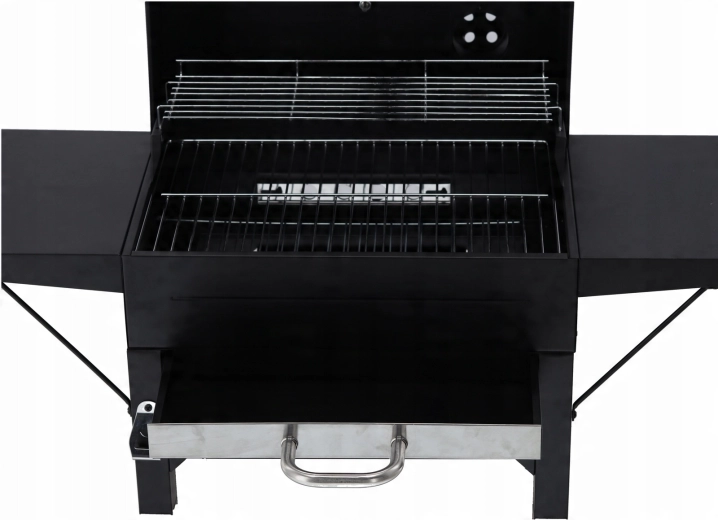 Doordachte details verhogen het comfort: een paar opklapbare tafels van 30 × 34 cm biedt werkruimte, de uitschuifbare aslade maakt reinigen eenvoudig en de transportwielen laten je de barbecue gemakkelijk verplaatsen. Verder aanwezig: drie roestvrijstalen handgrepen voor veilig bedienen, een verchroomd rek van 45 × 12 cm voor accessoires of opwarmen en een verzinkte houtskoolrooster voor een langere levensduur.