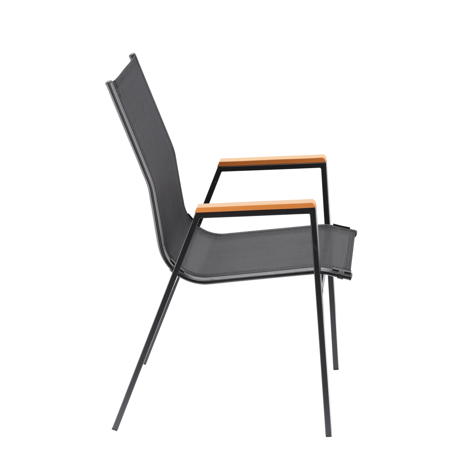 Elegante en duurzame tuinstoel met stalen frame, comfortabele zitting en rugleuning van ademend Textilene-mesh en stijlvolle armleuningen van polywood. Biedt hoog comfort, een stabiele constructie en weersbestendigheid voor terras, balkon en tuin.