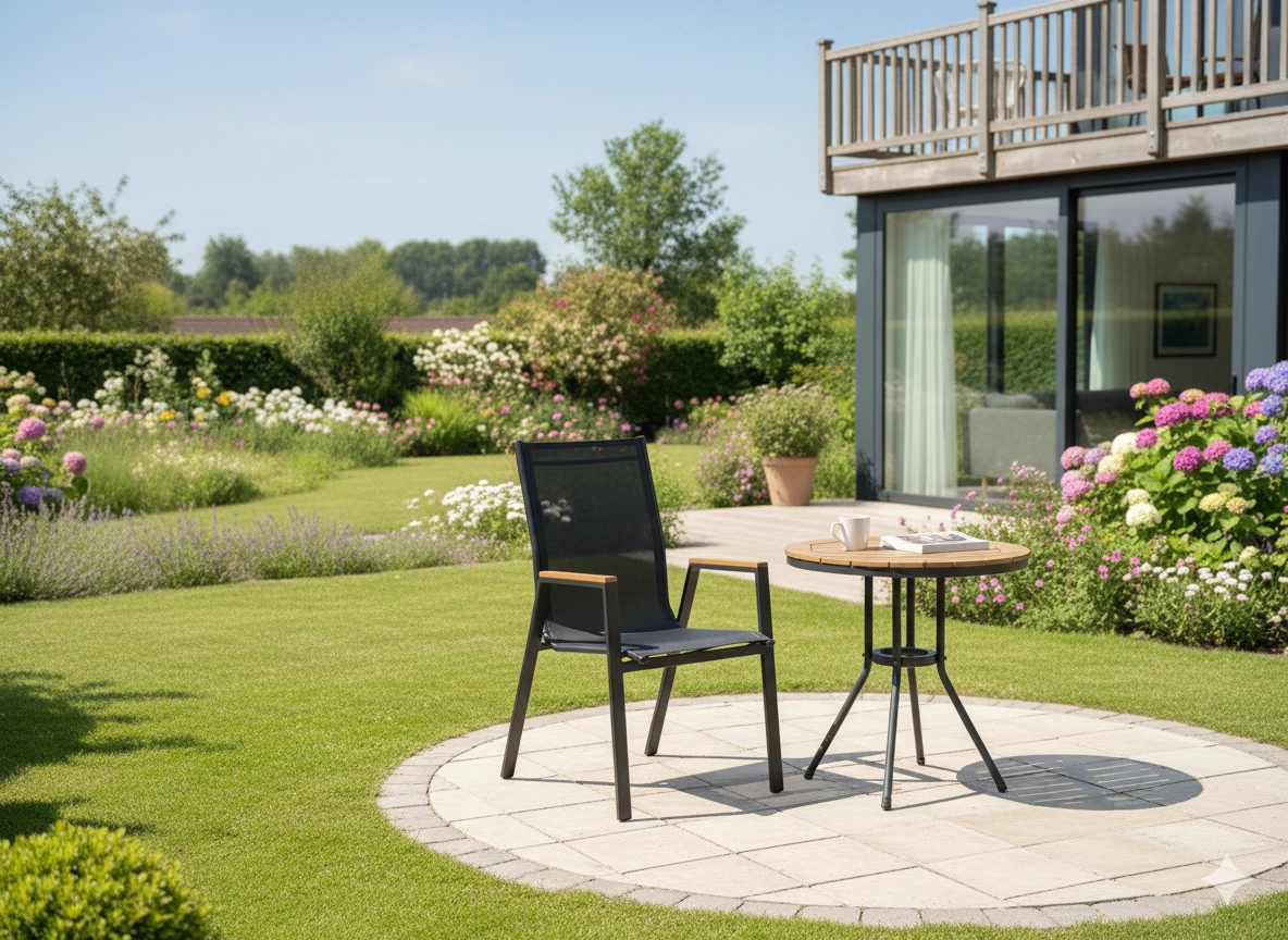 Op zoek naar een stevige en comfortabele tuinstoel die dagelijkse buitentoepassing moeiteloos aankan? Dit model combineert een stalen frame met poedercoating, Textilene 2×1 mesh met vulling voor extra comfort en armleuningen van polywood die ogen als hout maar nauwelijks onderhoud vragen.