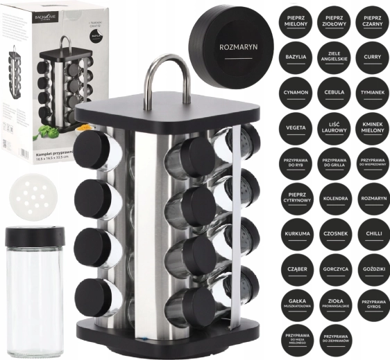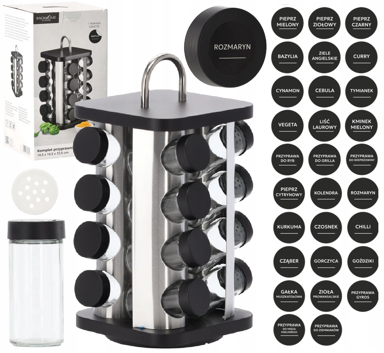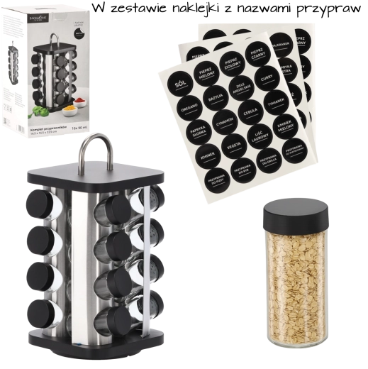 Het draaimechanisme zorgt ervoor dat uw favoriete ingrediënten altijd binnen handbereik zijn. De potjes zijn gerangschikt in 4 kolommen van 4 stuks, wat uitstekende overzichtelijkheid en ruimtebesparing biedt. De set van 38 stickers met kruidennamen helpt u de standaard precies aan uw behoeften aan te passen en orde in de keuken te bewaren.