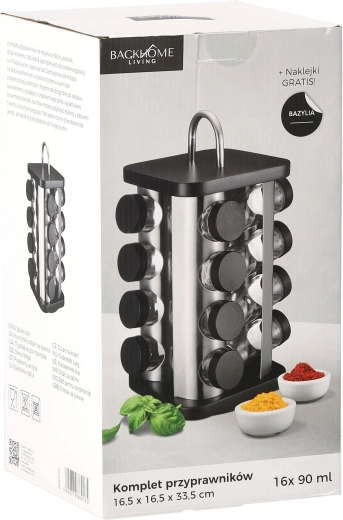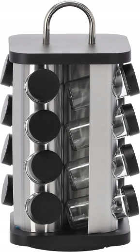 Elegante draaibare kruidenstandaard met een vierkante basis van 16,5 × 16,5 cm en een hoogte van 33,5 cm voor overzichtelijke en stijlvolle opslag van kruiden. Voorzien van een praktische handgreep voor eenvoudig dragen, inclusief 16 glazen potjes (90 ml) en vervaardigd uit duurzaam roestvrij staal met zwarte deksels. De draaiconstructie zorgt voor snelle toegang tot alle kruiden en de set wordt aangevuld met 38 stickers voor duidelijke labeling.
