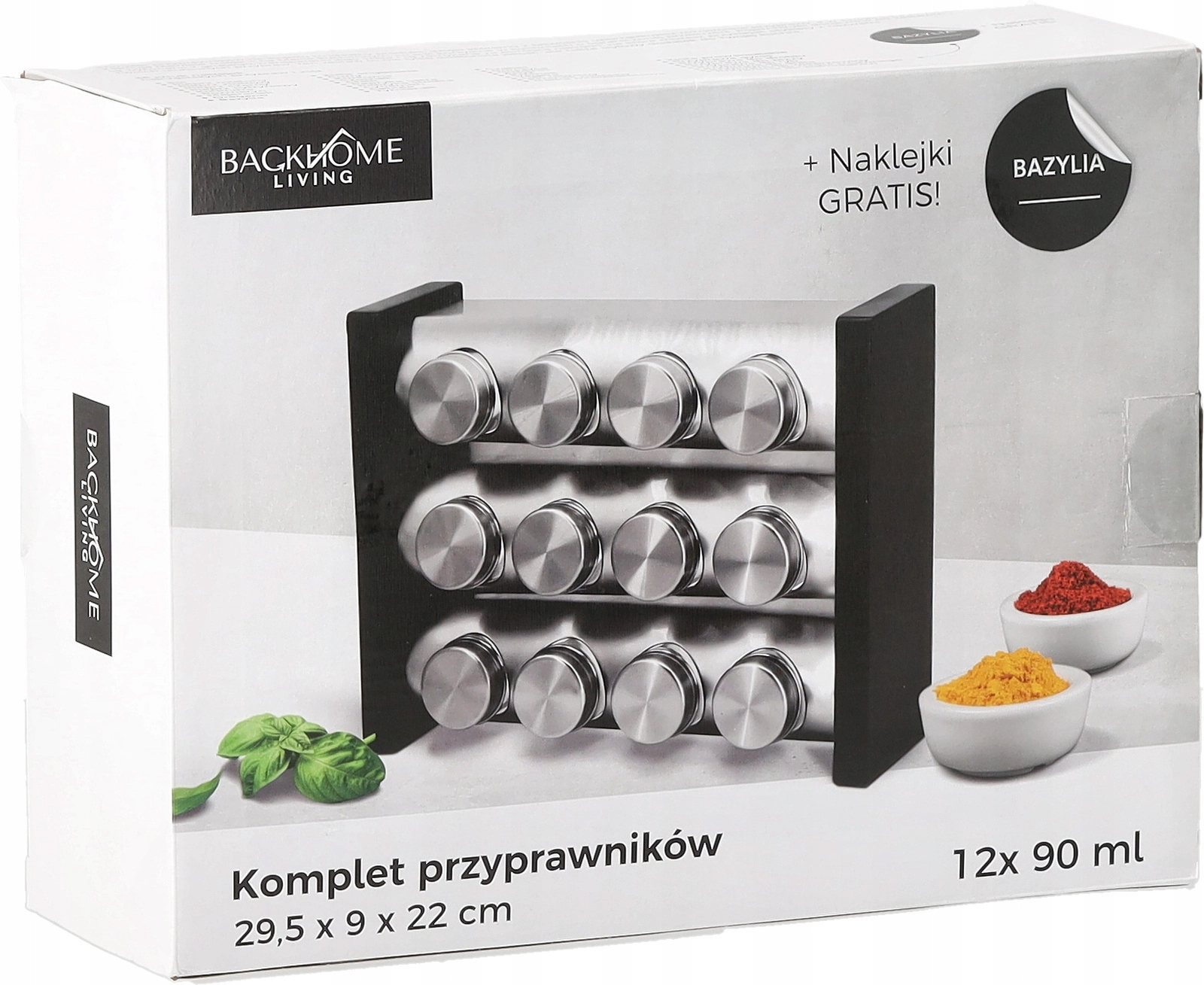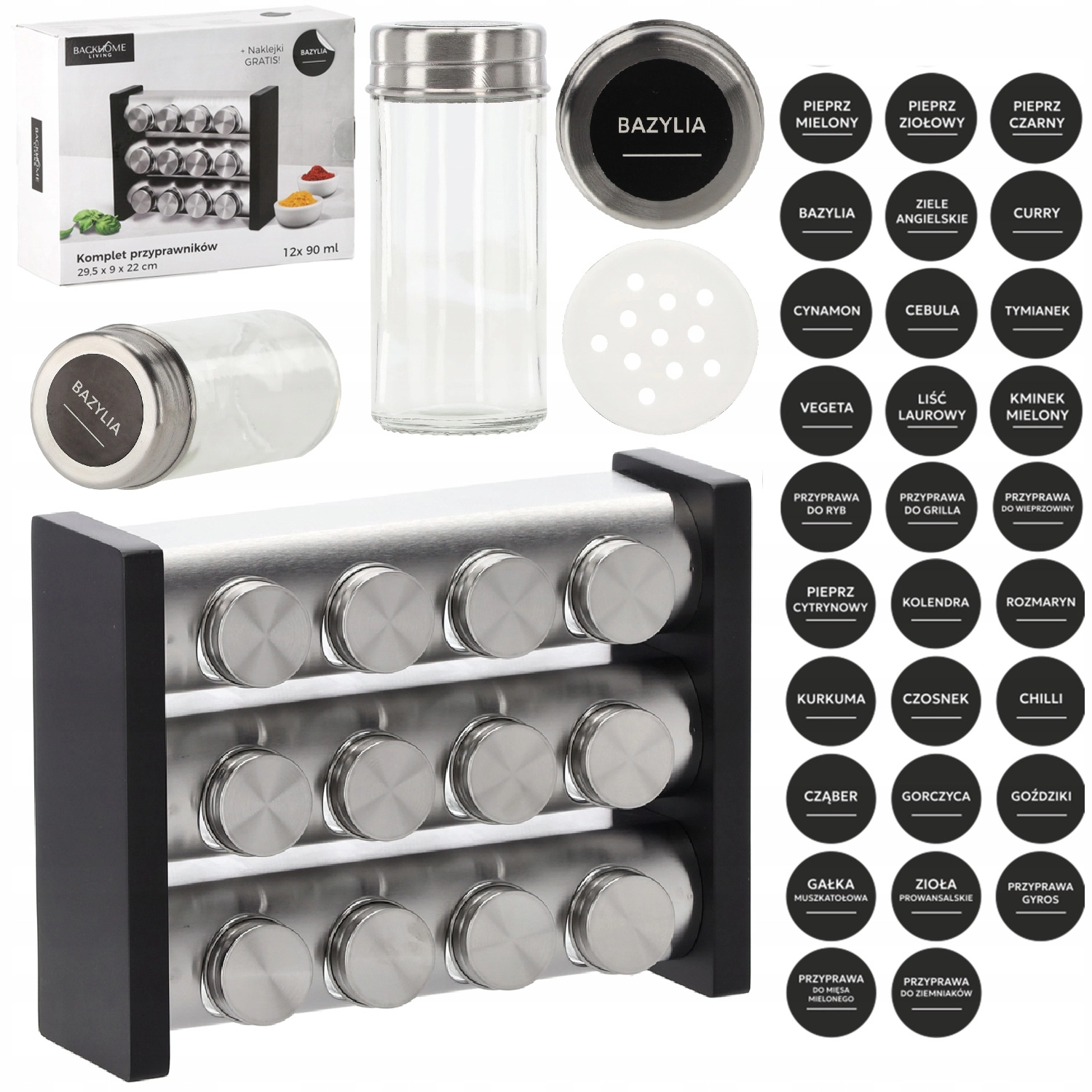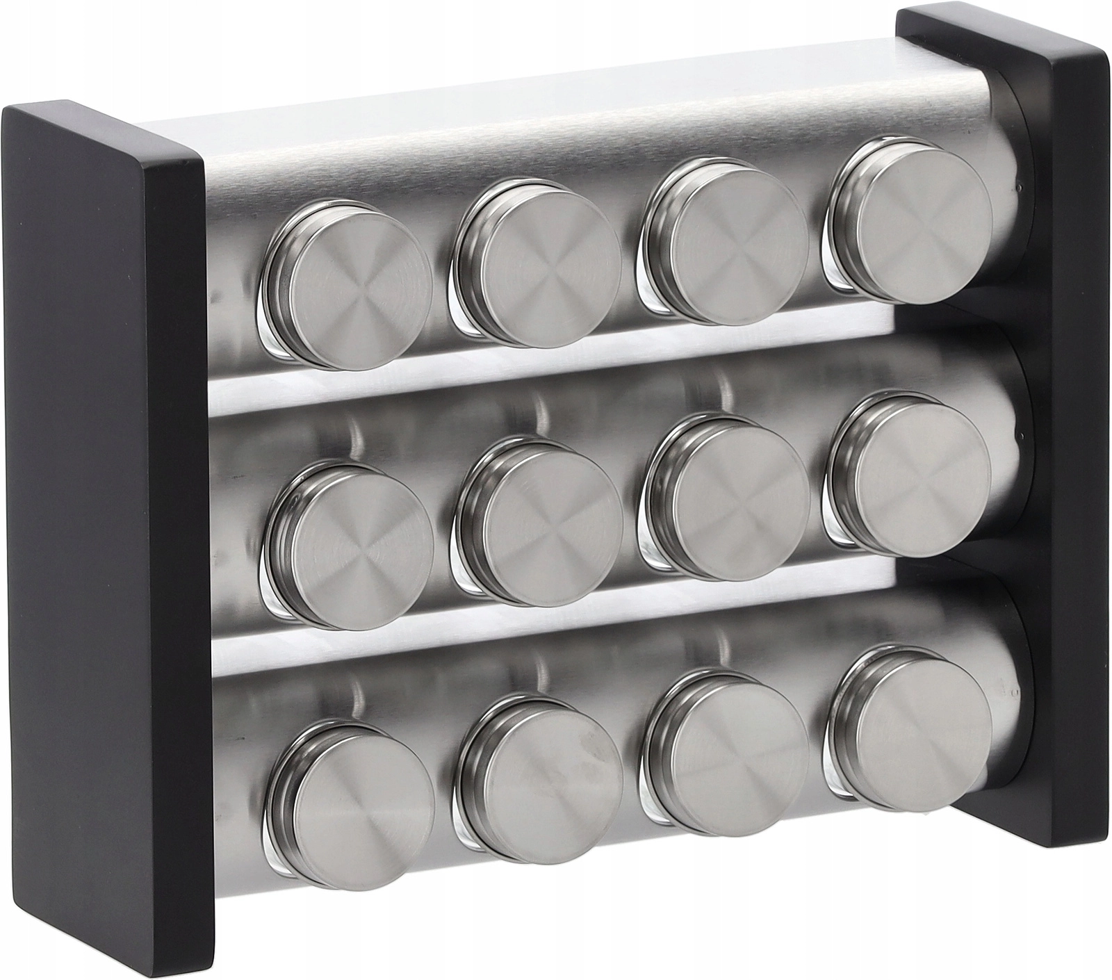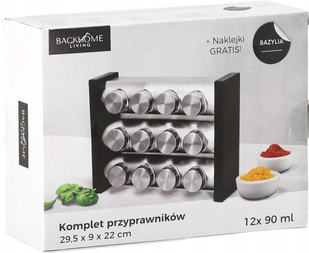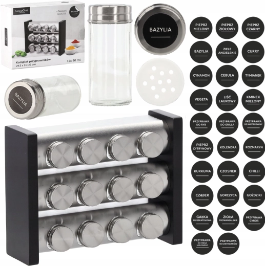 Het rek is gemaakt van hoogwaardig roestvrij staal en aangevuld met zijkanten in houtdecor, gelakt in het zwart voor een stijlvolle contrastlook. Elk potje heeft een inhoud van 90 ml – ideaal voor zout, peper, kruiden en gemalen melanges. De set bevat 38 voorgedrukte stickers met de meest voorkomende kruidennamen, zodat je eenvoudig een eigen, overzichtelijk labelsysteem creëert.
