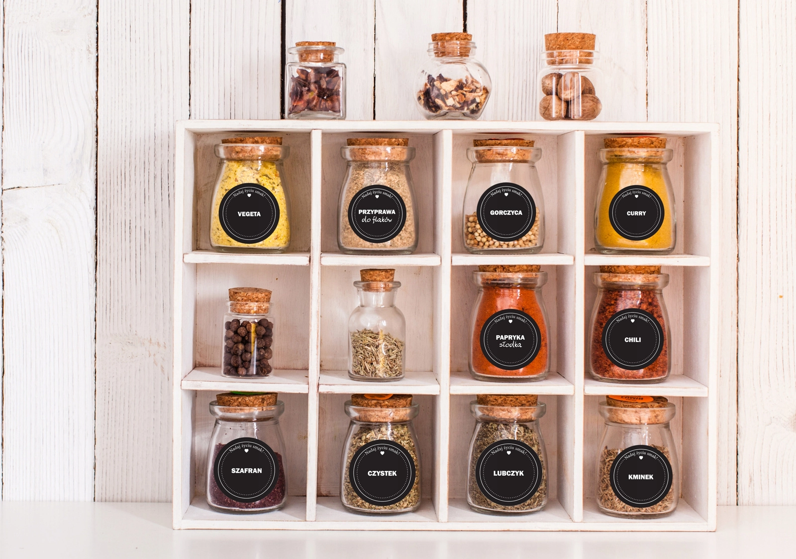 - Overzicht en orde: zichtbare en uniforme etikettering van kruidenpotjes.