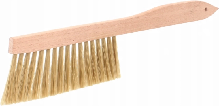 Zachte imkerveger van natuurlijke borstels voor voorzichtig afvegen van bijen van ramen tijdens het honen en bij reguliere controle van de kast. De lange houten handgreep met ophanggat en de dichte, zachte borstelharen zorgen voor schoon werk zonder onnodige stress voor de bijen.