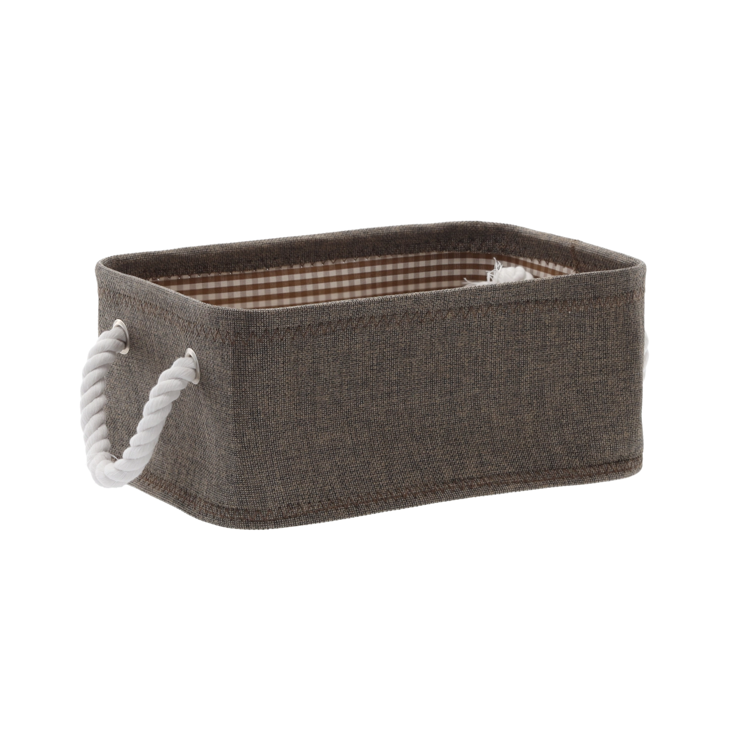 De neutrale bruine stof en de subtiele geruite voering vullen een modern interieur aan en helpen orde te houden op planken en dressoirs.