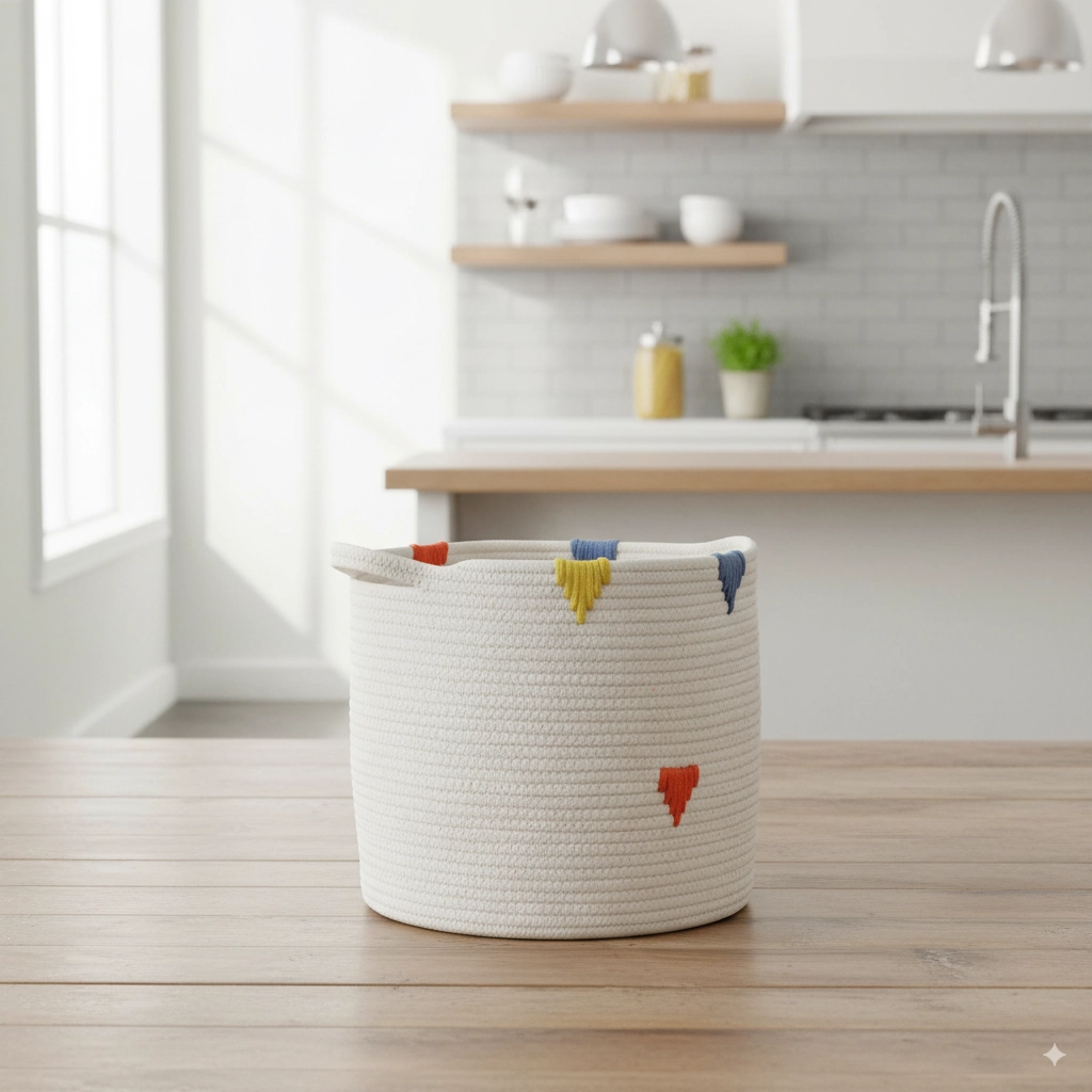 Praktische en stijlvolle mand voor dagelijkse orde in huis. De compacte afmetingen 27 × 24 cm besparen ruimte, de lichte constructie maakt dragen eenvoudig en het duurzame materiaal zorgt voor een lange levensduur. De tijdloze witte look met kleurrijk patroon past in de badkamer, kinderkamer en woonkamer en helpt bovendien kleine vuiligheden te verbergen.