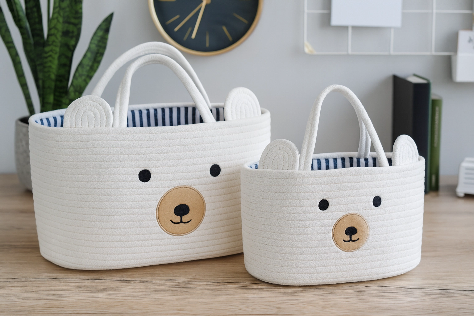 Zoek je een stijlvolle en functionele oplossing voor het opbergen van speelgoed, kleding of kleinigheden? Deze witte mand met een schattig beertjesmotief combineert een praktische opbergruimte met een decoratief design. Dankzij de twee stevige handgrepen draag je hem moeiteloos tussen kamers, en de gestructureerde wanden behouden mooi hun vorm.