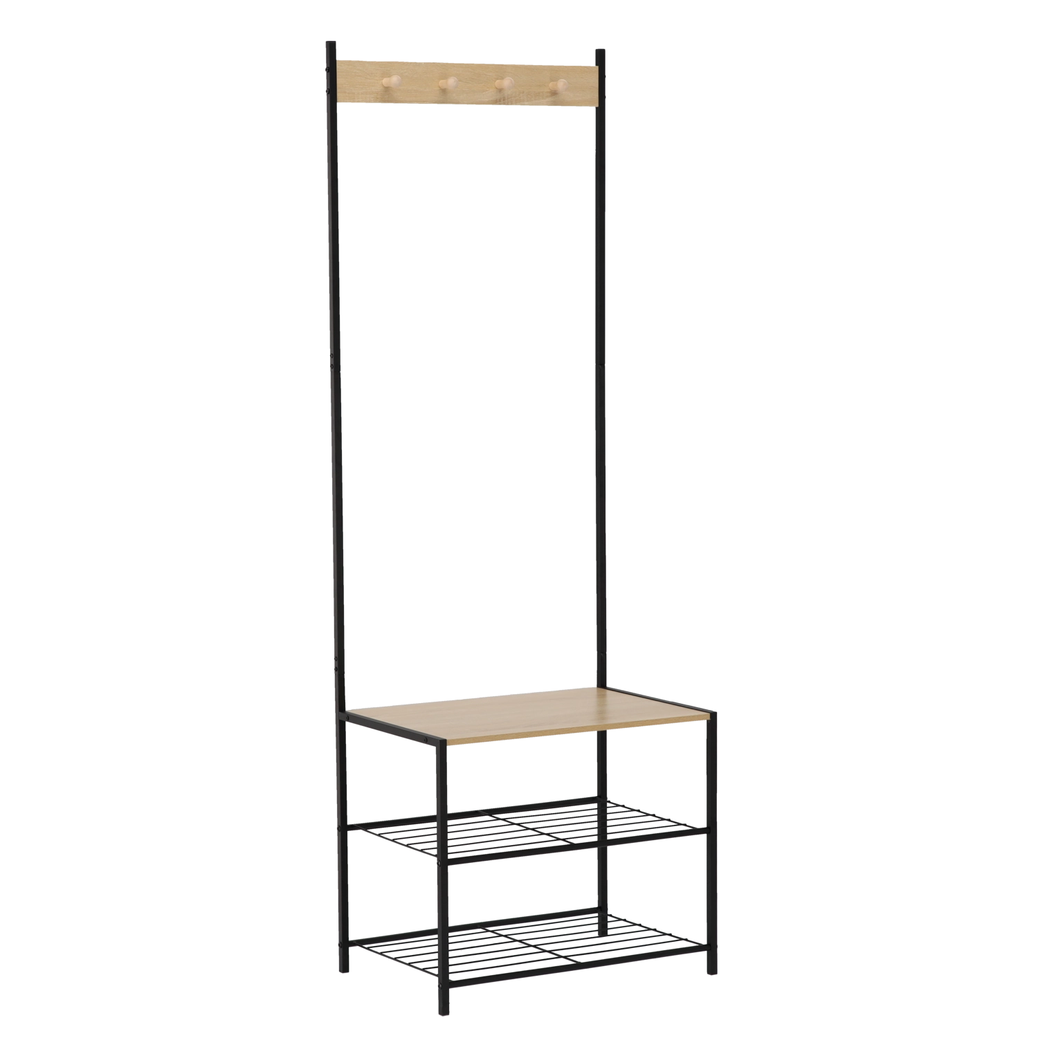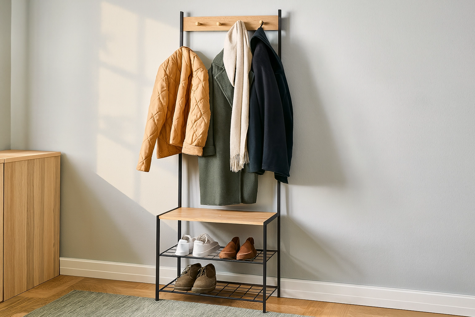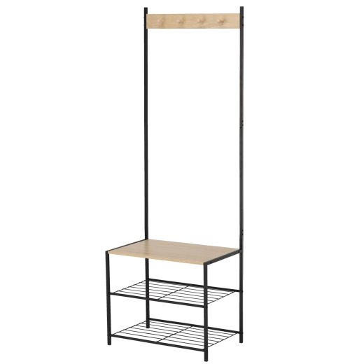 Het robuuste frame van gecoat metaal zorgt voor stabiliteit en een lange levensduur, terwijl houten accenten een warme loftuitstraling geven. Twee onderste metalen planken bieden plaats aan meerdere paar schoenen, terwijl de bovenste rail met haken jacks, sjaals en handtassen overzichtelijk bij elkaar houdt.