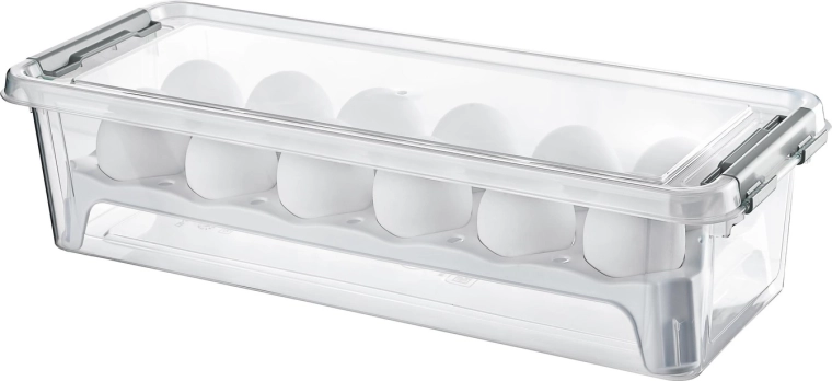 Praktische rechthoekige eierdoos voor maximaal 12 stuks, gemaakt van hoogwaardig kunststof zonder schadelijke BPA. Dankzij het gemakkelijke openen, de duurzame uitvoering en de mogelijkheid tot opslag in koelkast en vriezer is hij ideaal voor dagelijks gebruik en veilig transport van eieren. Vaatwasmachinebestendig.