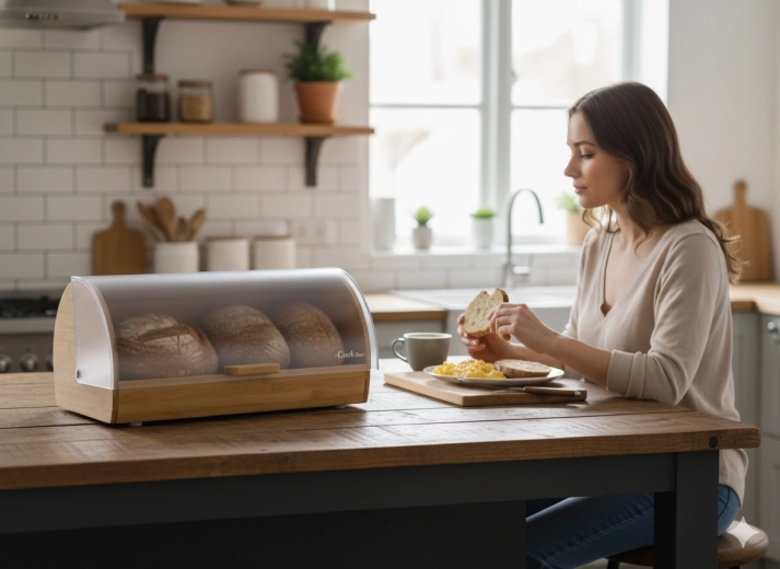Het halfdoorzichtige deksel beschermt brood en gebak tegen uitdroging en stof, en maakt het tegelijk mogelijk de inhoud snel te controleren zonder te openen.
