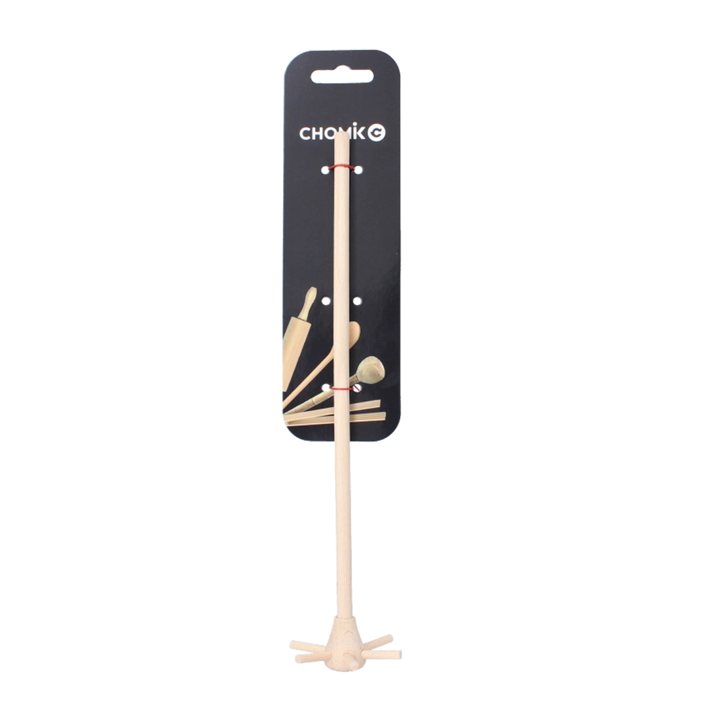 Universele houten garde met een klassieke vorm die moeiteloos sauzen, crèmes en soepen mengt. Dankzij de lengte van 27 cm bereik je comfortabel de bodem van de pan en blijft het oppervlak ongeschonden – krast geen antiaanbak- of geëmailleerde pannen.
