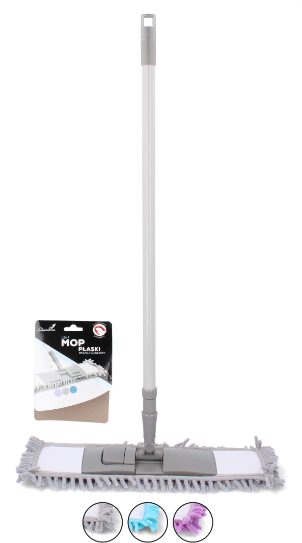 De platte mop met chenillevezel is een praktische hulp voor snel en zacht vloeronderhoud. Dankzij de hoge absorptie en de zachte chenille-franjes vangt hij stof effectief op bij droog wissen en verwijdert hij bij nat reinigen zelfs hardnekkige vlekken zonder chemicaliën. Het dunne platte profiel komt eenvoudig onder meubels en in hoeken, terwijl de telescopische metalen steel 65–116 cm comfortabele lengte-instelling voor iedereen biedt.
