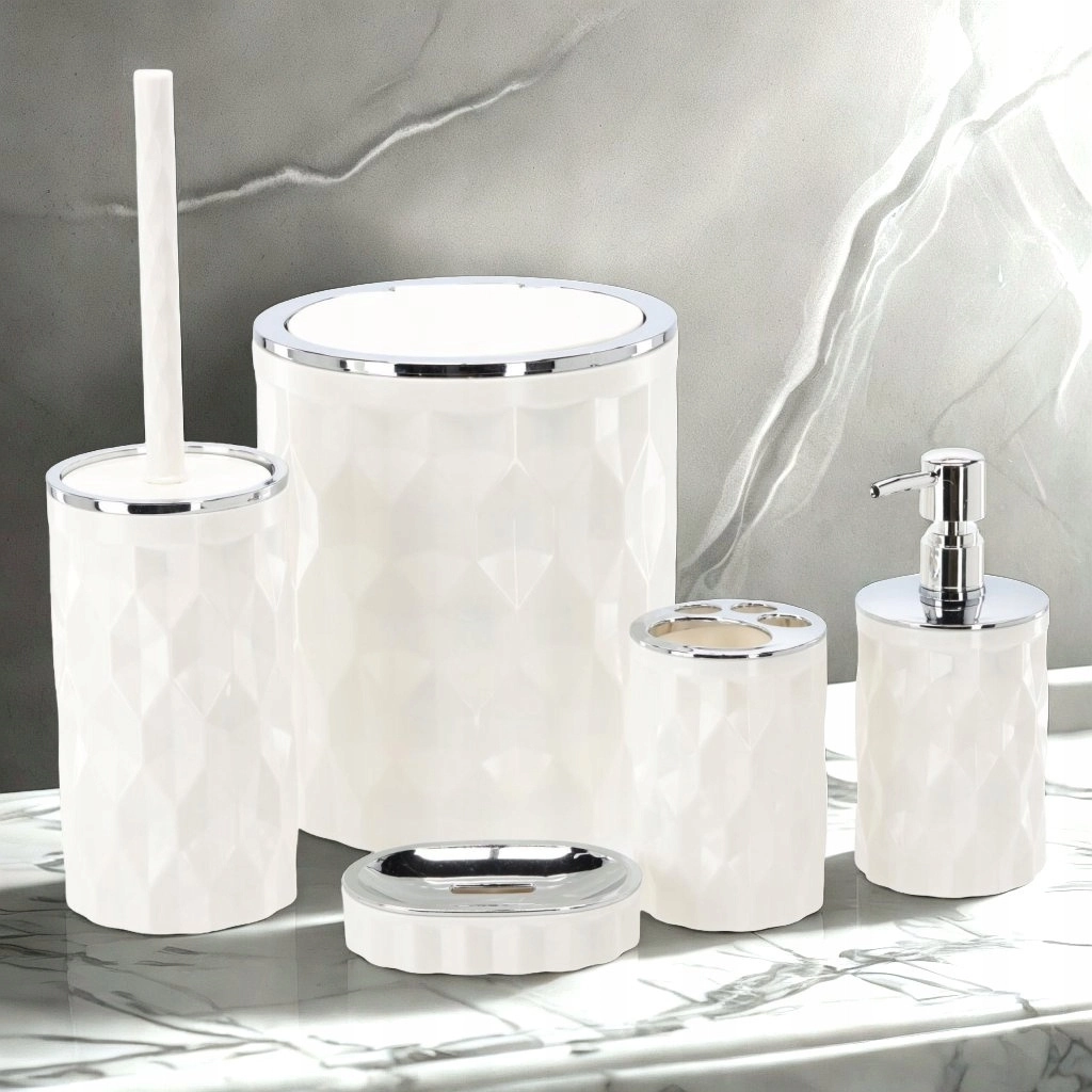 Stijlvolle vijfdelige set badkameraccessoires in elegant wit met alles wat je nodig hebt voor dagelijkse hygiëne en orde. Dankzij het uniforme design met moderne details en de praktische indeling krijg je een strakke, harmonieuze look in de badkamer en is het onderhoud eenvoudig. De set bevat een prullenbak, toiletborstel met houder, zeepdispenser voor vloeibare zeep, tandenborstelhouder en een zeepschaaltje.