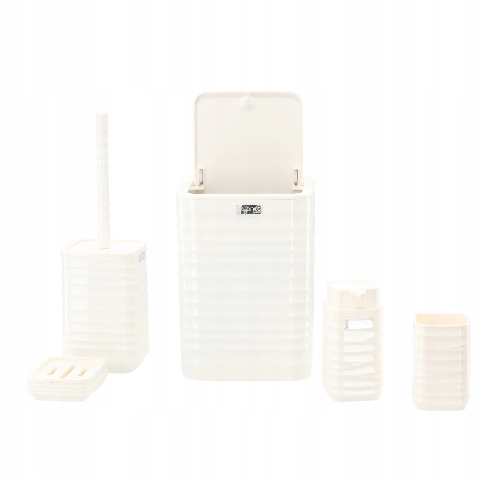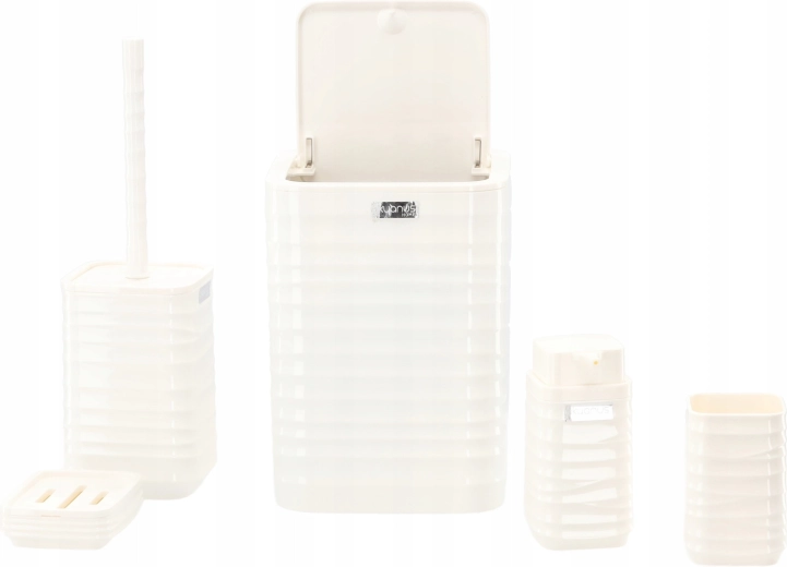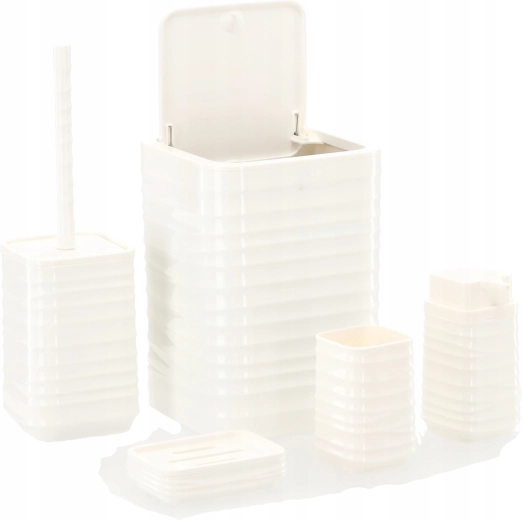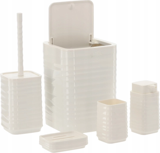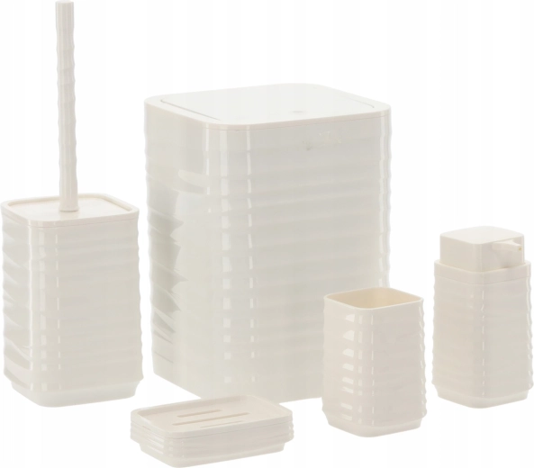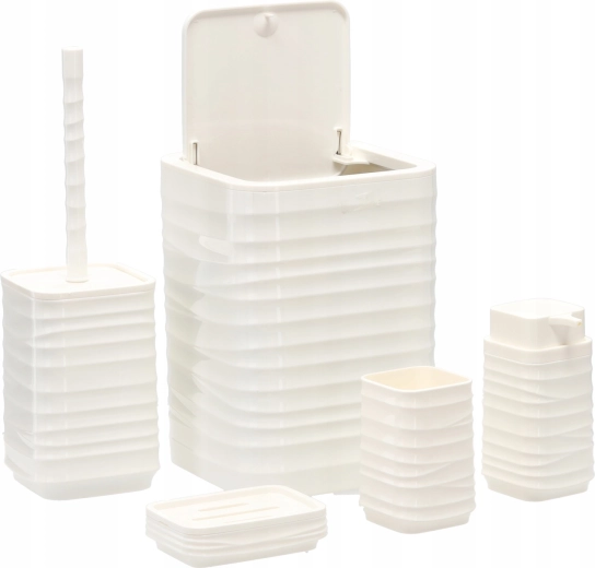 Deze vijfdelige badkamerset in universeel wit biedt een functionele en stijlvolle oplossing voor elk huishouden. Het geribbelde oppervlak en de vierkante lijnen ogen strak en modern, terwijl het duurzame kunststof zorgt voor eenvoudig reinigen en een lange levensduur.