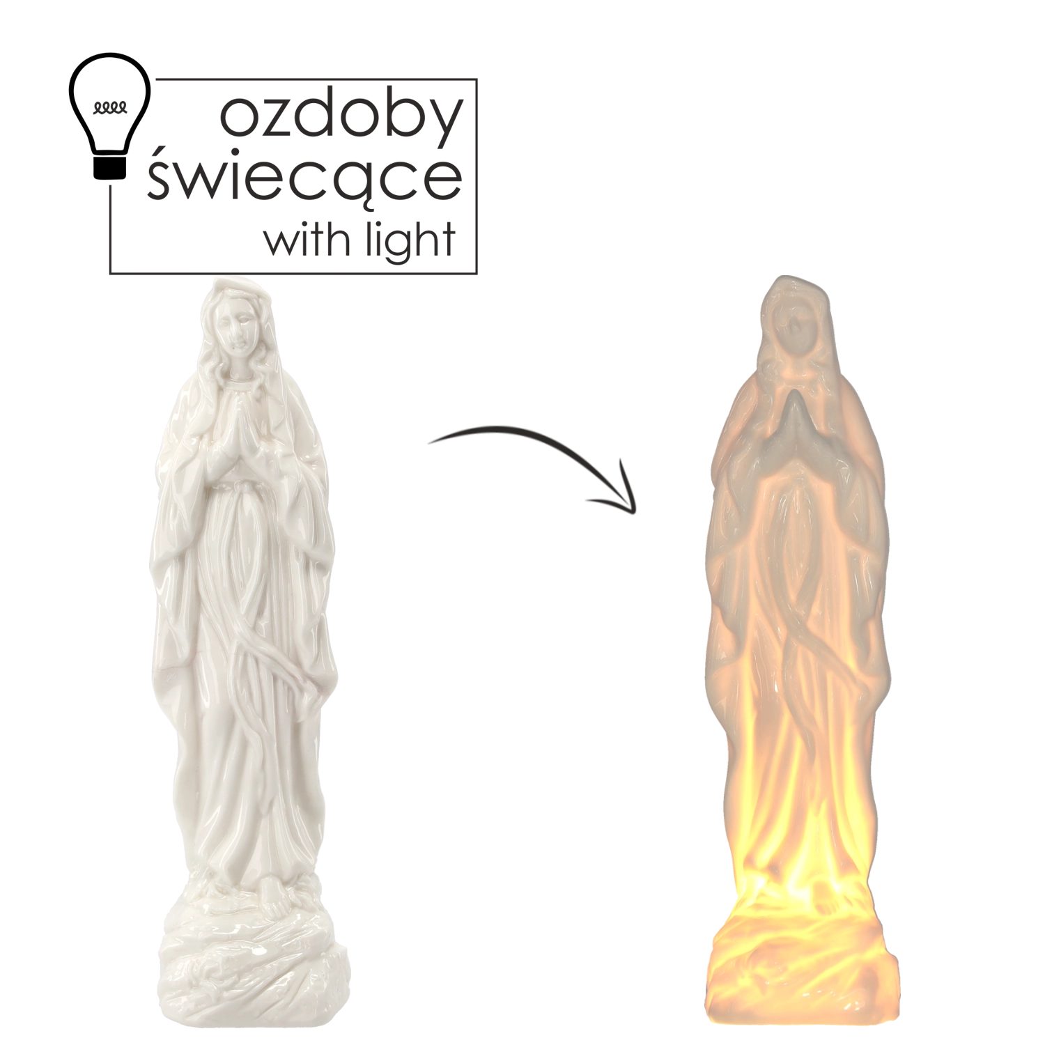 Elegant porseleinen Mariabeeldje van 28,8 cm hoog met geïntegreerde LED-verlichting dat een warm en rustgevend sfeertje in huis creëert. Dankzij de batterijvoeding kan het overal zonder kabels geplaatst worden, ideaal voor kerstdecoraties en voor dagelijkse spirituele verstilling.