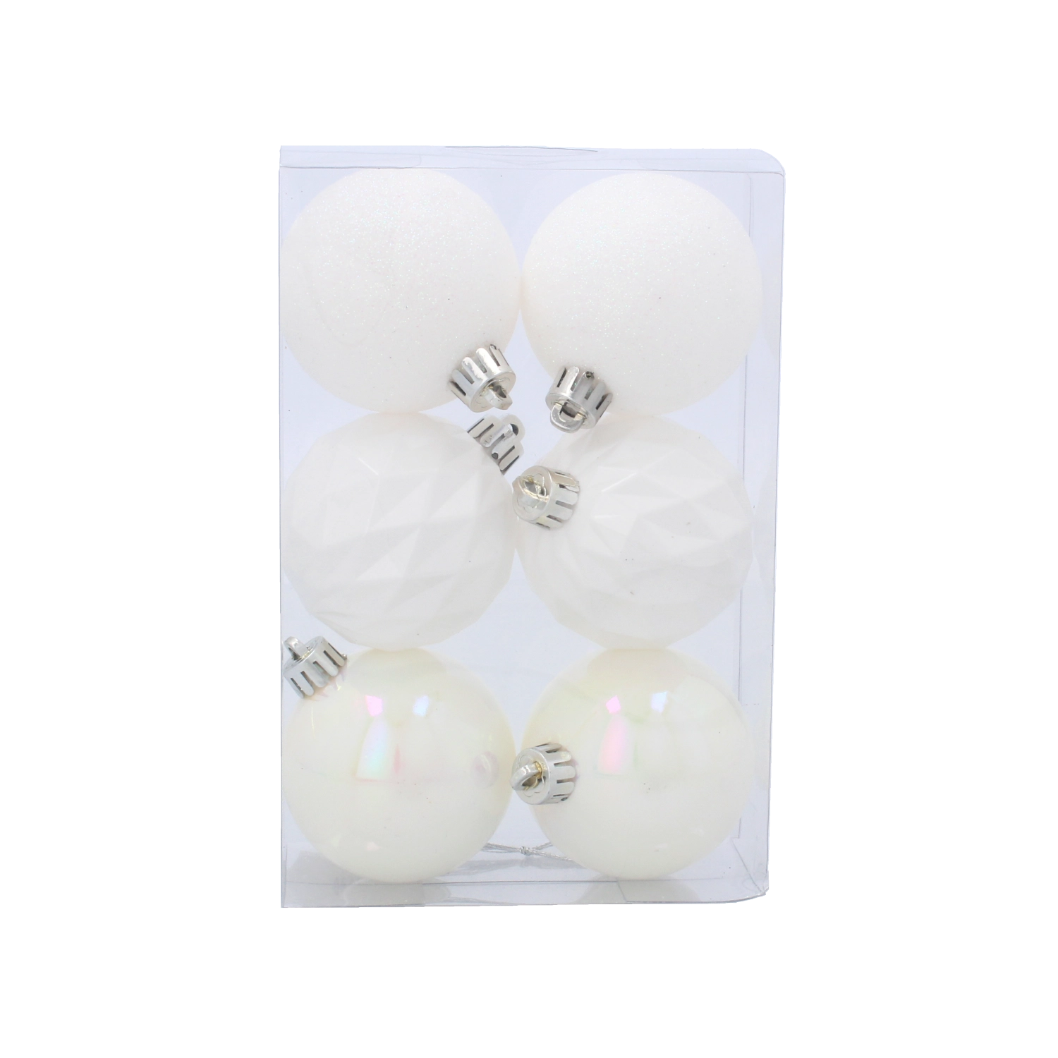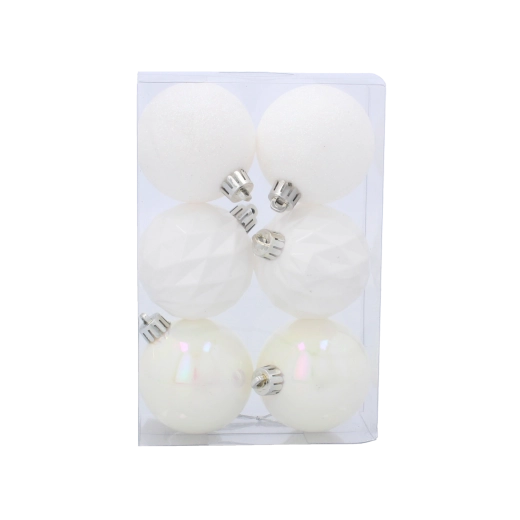 Elke bal is voorzien van een metalen ophangoog en de set wordt geleverd in een praktische doos voor overzichtelijke opslag na de feestdagen. De combinatie van matte, parelmoer- en facetstructuren zorgt voor een harmonieuze en luxueuze uitstraling die past bij zowel traditionele als moderne decoraties.