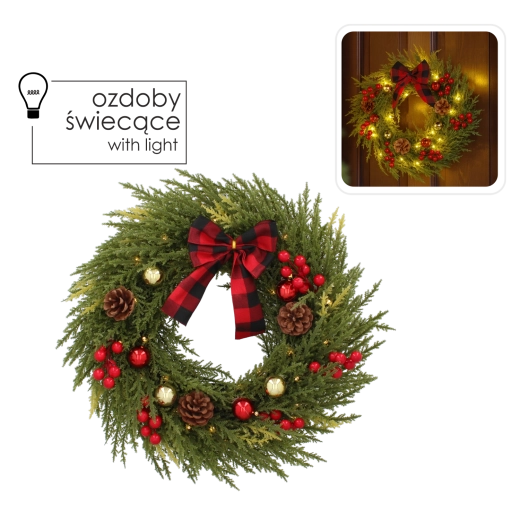 De elegante kerst LED-krans brengt een huiselijke sfeer met warmwit licht en een volle, realistische dennentak-look, aangevuld met decoratieve elementen zoals bessen, dennenappels en een stijlvolle geruite strik. Dankzij de voeding op 3× AA-batterijen hang je hem eenvoudig aan deur, muur of raam zonder zichtbare kabels.