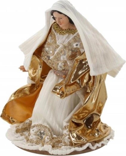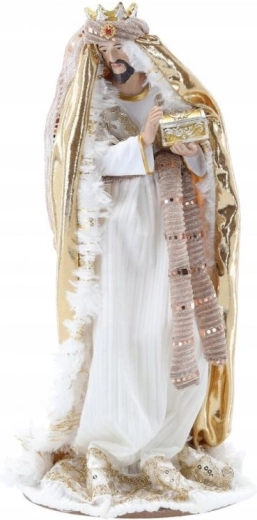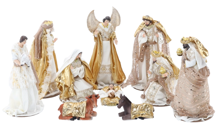 Deze representatieve set omvat de Heilige Familie, een engel, de Drie Koningen, een herder en dieren – alles in een harmonieuze wit-gouden stijl die past bij zowel moderne als klassieke interieurs. Handmatig afgewerkte details en subtiele metallic accenten geven de scène een uitzonderlijke uitstraling.