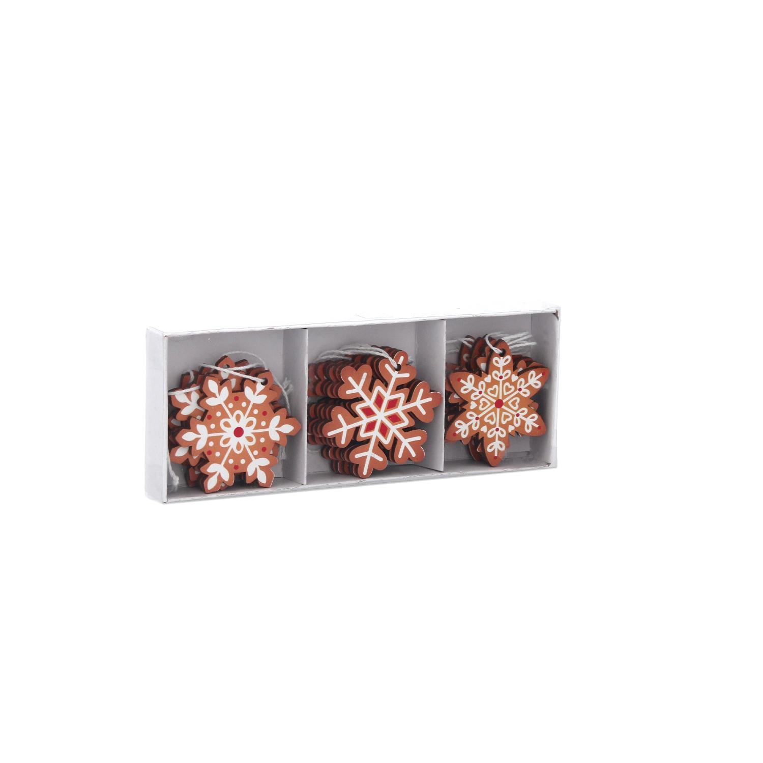 Breng een traditionele kerstsfeer in huis met een set van 18 houten ornamenten in de vorm van sneeuwvlokken. Elk stuk is zorgvuldig uitgesneden uit hoogwaardig hout, heeft een natuurlijke bruine rustieke uitstraling en komt dankzij de wit-rode decoraties prachtig tot zijn recht in de boom, op een guirlande of krans. De ornamenten zijn duurzaam en splintervrij, gemakkelijk op te hangen met een lint en een ideale keuze voor een ecologische en duurzame decoratie.
