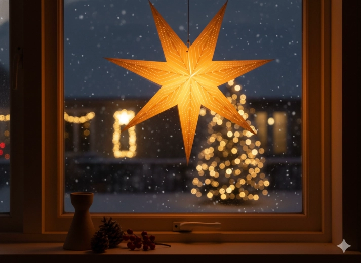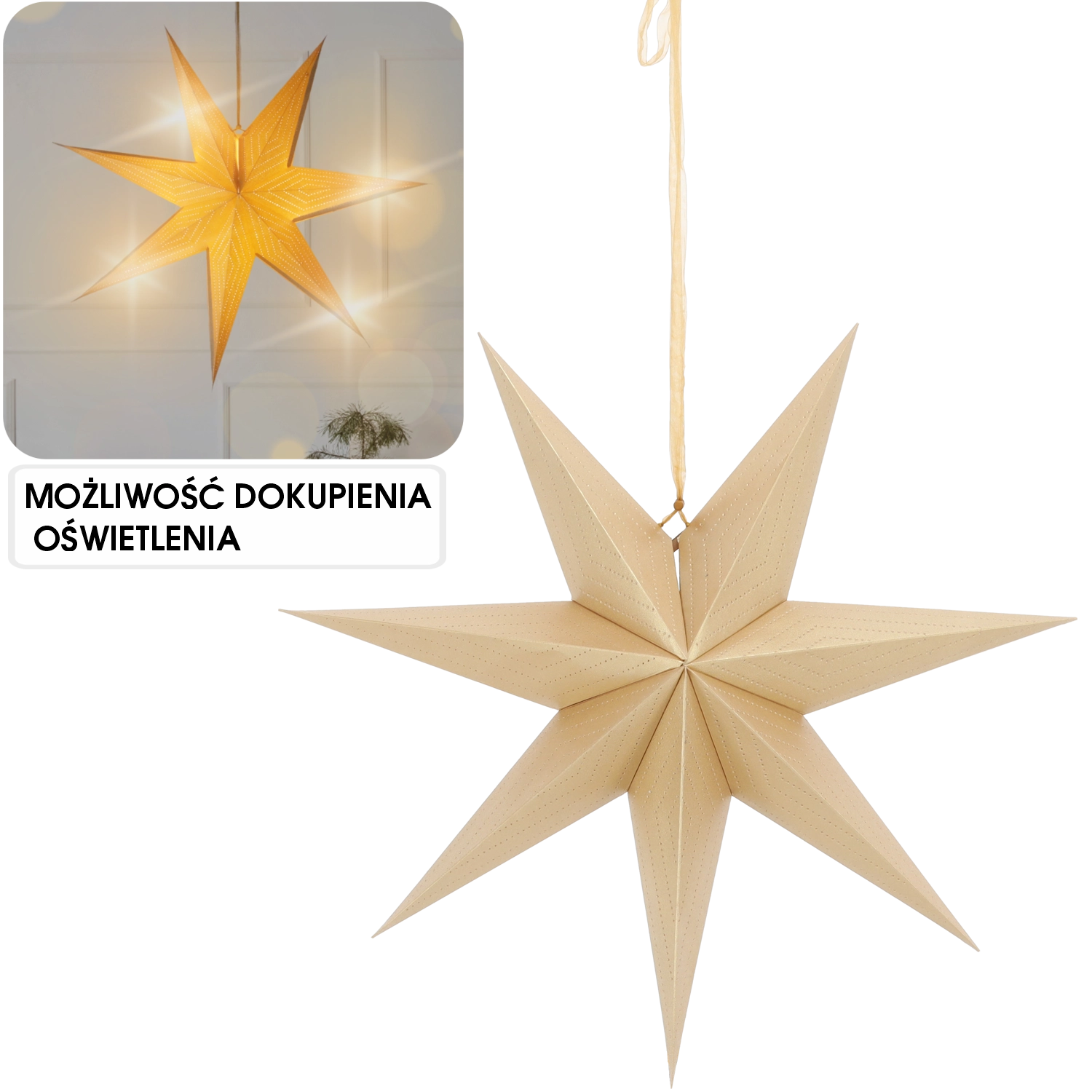 Elegante decoratieve ster met een diameter van 60 cm in luxe goud geeft je huis een feestelijke sfeer. De zevenpuntige vorm en het fijne geperforeerde patroon zorgen voor indrukwekkende lichteffecten, vooral bij een lichtbron. Eenvoudig op te hangen, opvouwbaar en gemaakt van FSC-gecertificeerd papier – een mooie en milieuvriendelijke keuze voor het raam, aan de muur of boven de tafel.
