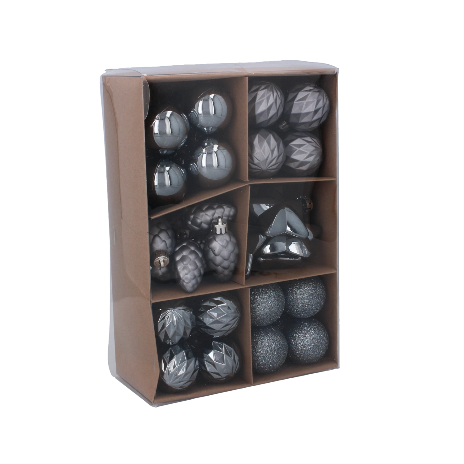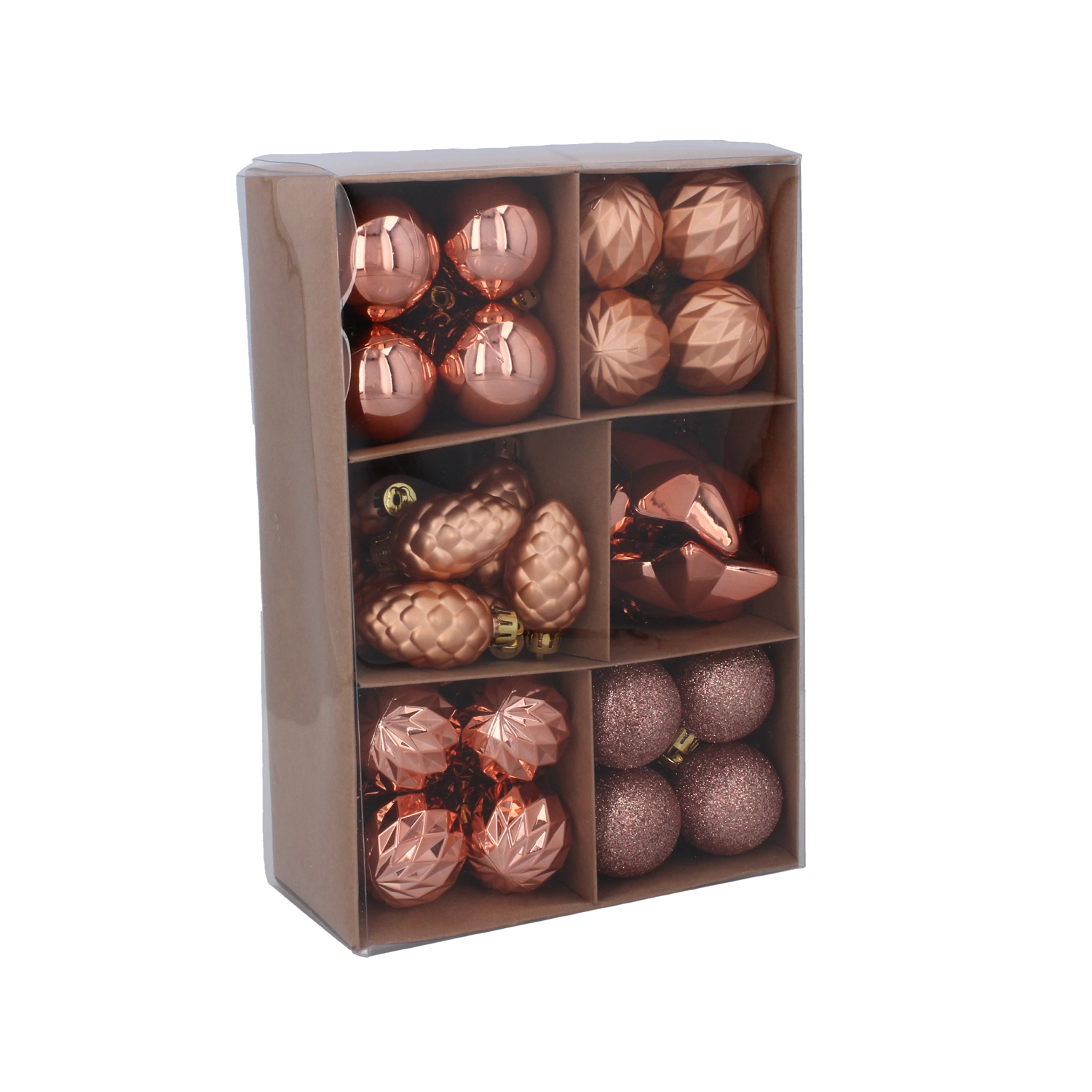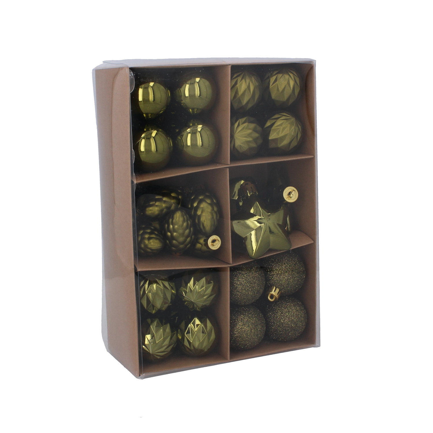 Een elegante set van 47 kerstversieringen in tinten olijf, koper en grafiet tovert je boom om tot een moderne, feestelijke decoratie. De diverse afwerkingen – glanzend, mat, facetgeslepen en glitter – zorgen voor een harmonieuze en stijlvolle look. De ornamenten zijn gemaakt van duurzaam, licht kunststof voor eenvoudig en veilig ophangen en een lange levensduur.