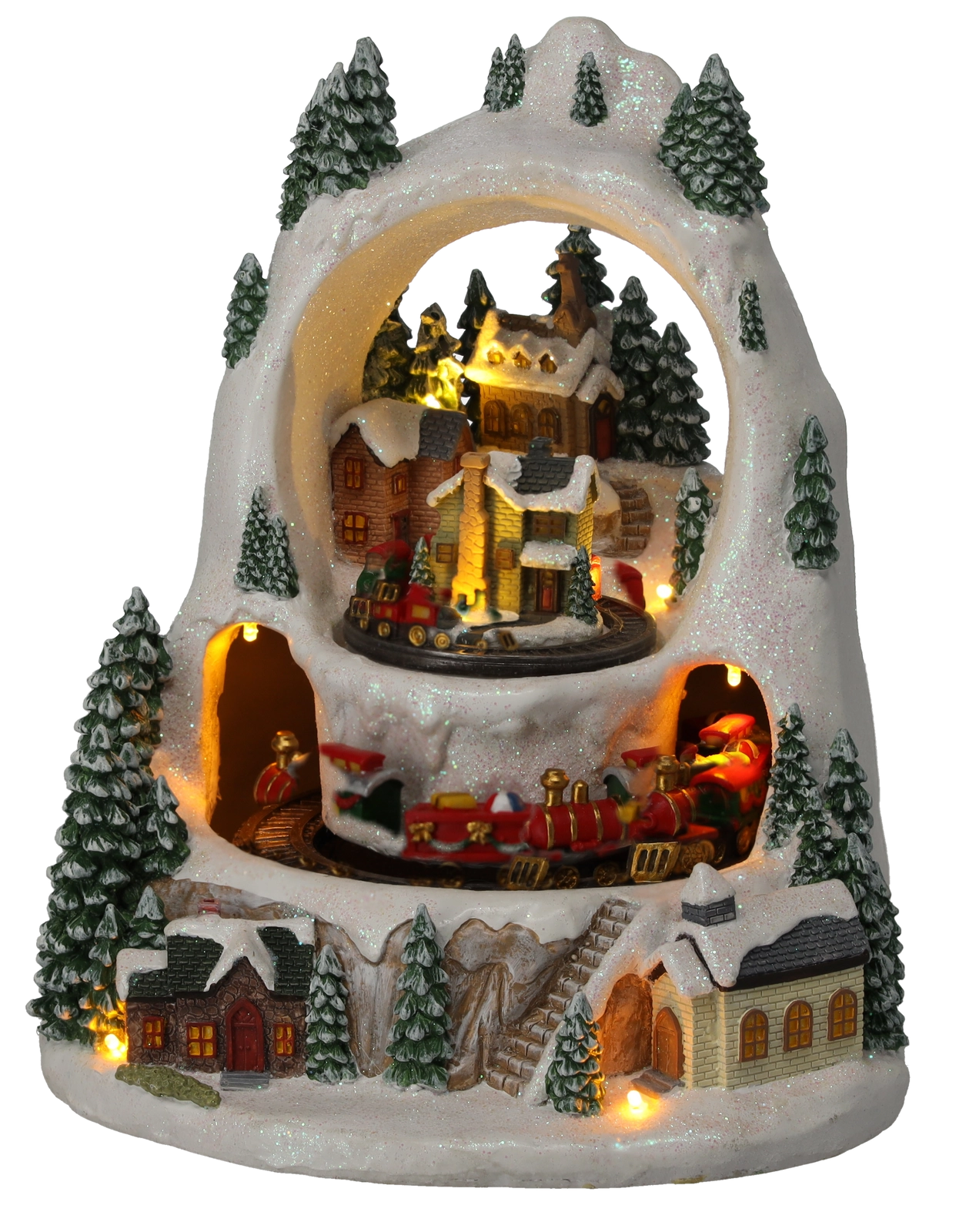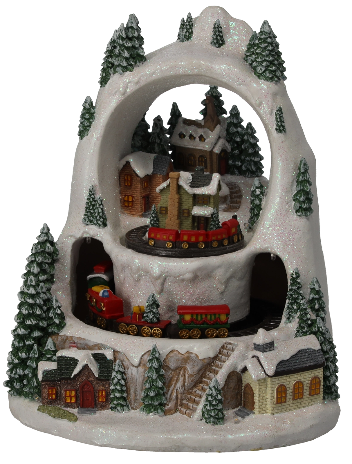 Creëer thuis een klein winterwonder. Het gedetailleerde kerstdorp met besneeuwde huisjes en bomen komt tot leven door de beweging van treintjes op twee niveaus, het prettig warme ledlicht en de mogelijkheid om klassieke feestmelodieën af te spelen. Kies tussen een modus met geluid of een stille werking met alleen licht en animatie.