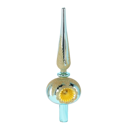 Elegante glazen piek in blauwe kleur met gouden details geeft je boom een verfijnde en feestelijke uitstraling. Dankzij de afmetingen 8,5 × 28 cm wordt het een opvallend element van de kerstdecoratie, terwijl het kwaliteitsglas en de zorgvuldige afwerking duurzaamheid en een lange levensduur garanderen. De lichte constructie maakt eenvoudige en veilige plaatsing op de top van de boom mogelijk.