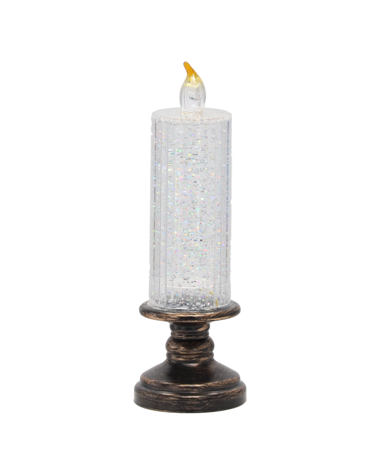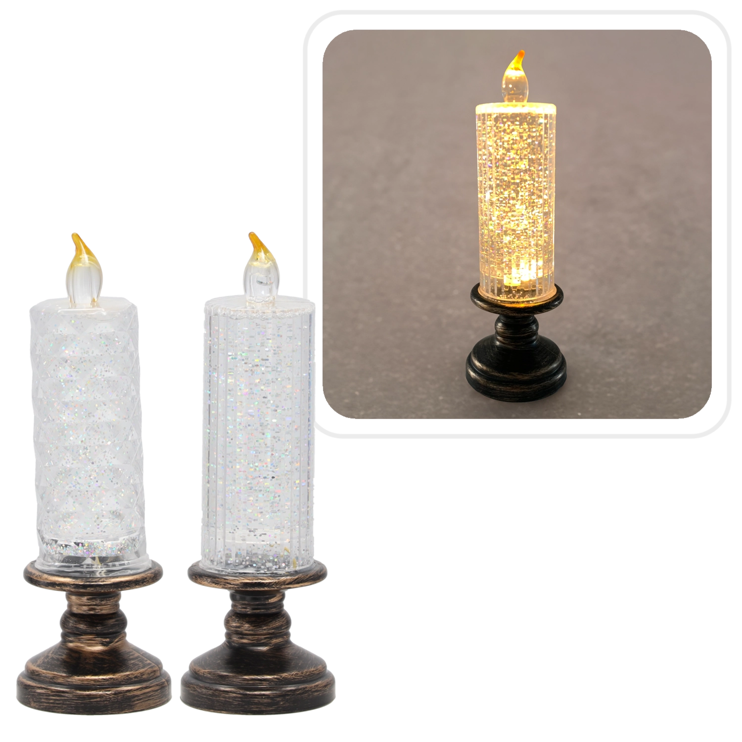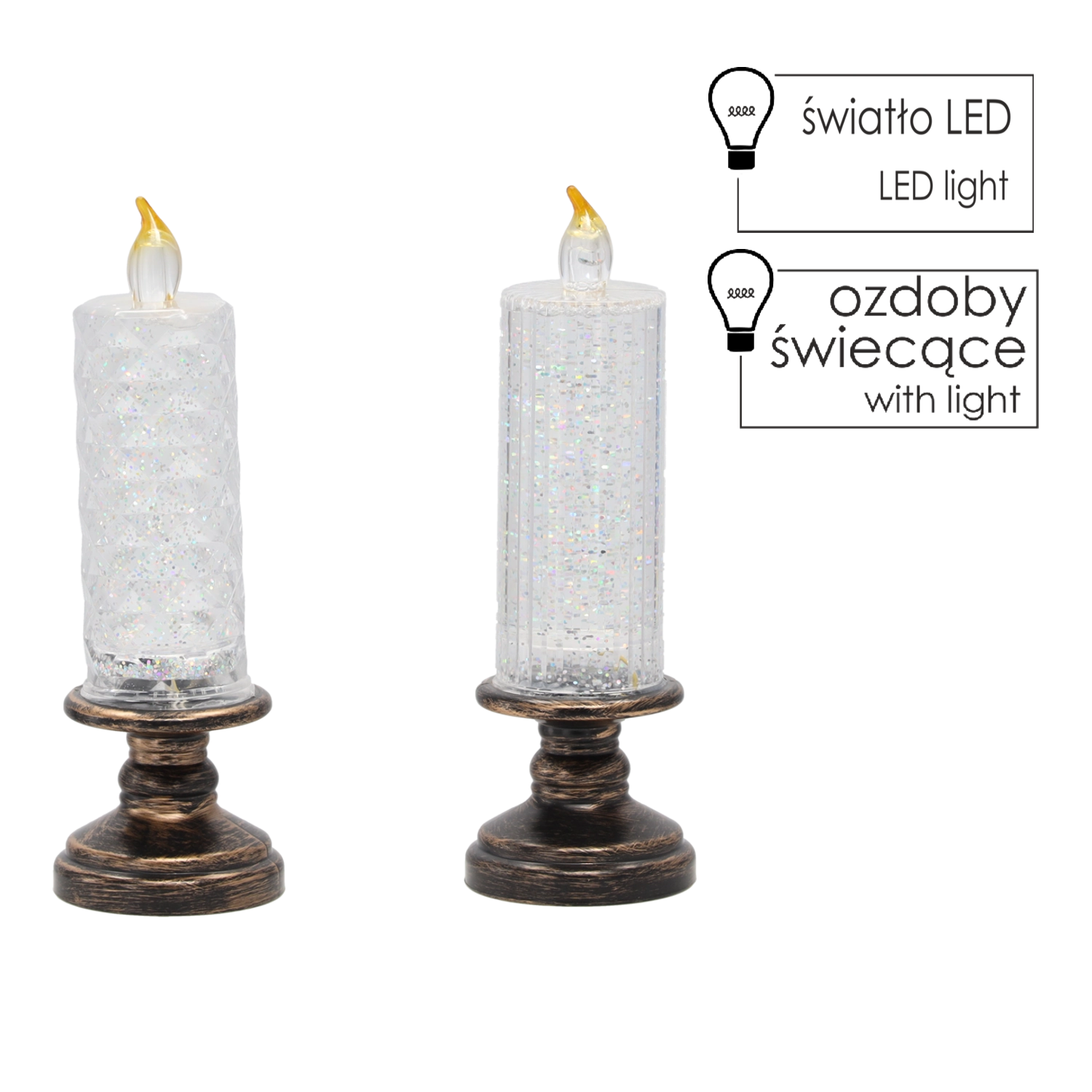 Stijlvolle decoratieve LED-kaars met een transparante cilinder vol glitters en een vintage voet creëert in een oogwenk een knusse sfeer. Zodra je het licht aandoet, ontstaat er een zacht warm licht en een stralend sprankelend effect, ideaal voor op tafel, dressoir of vensterbank. De voeding gebeurt via LR44-batterijen, zodat je haar eenvoudig overal zonder kabels kunt plaatsen.
